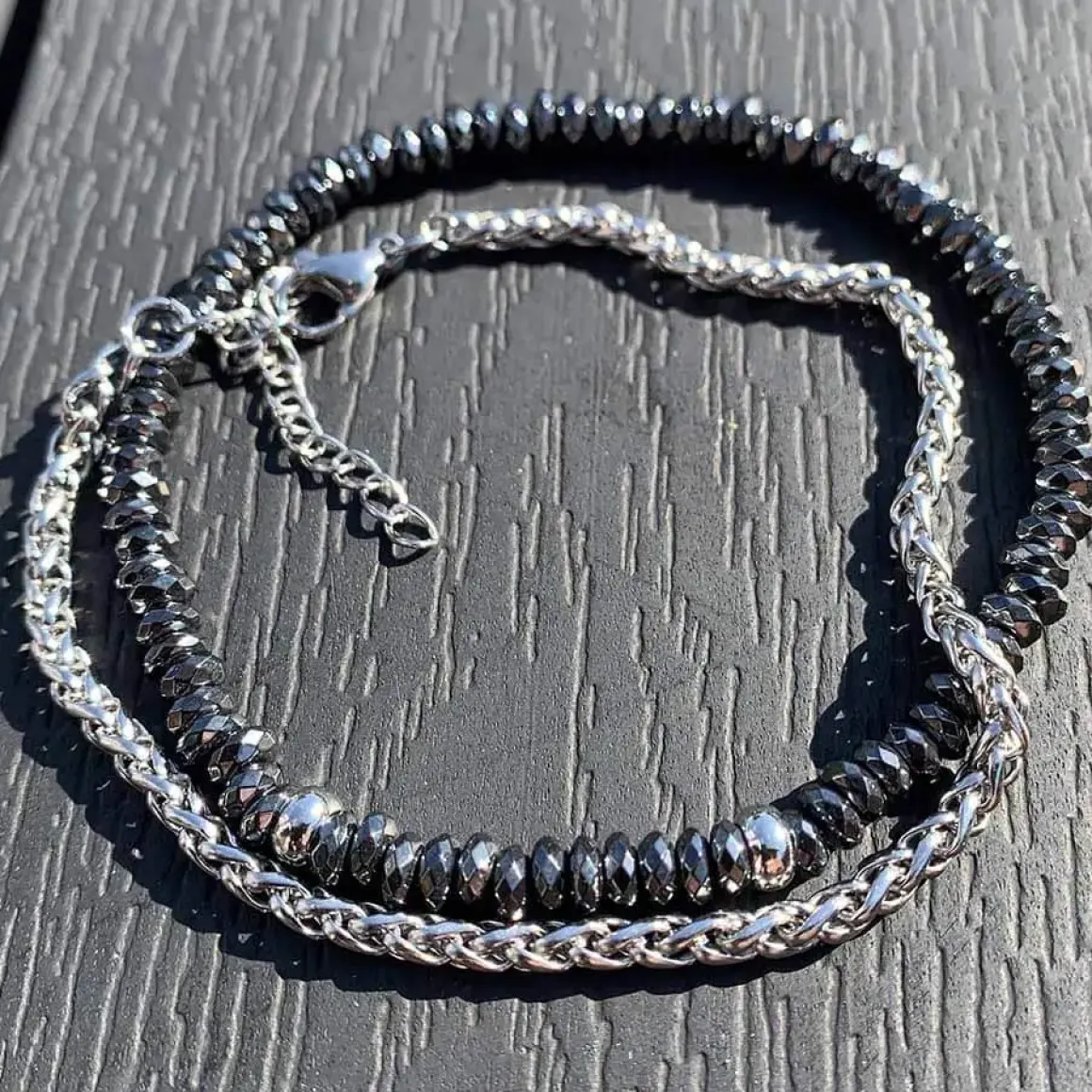 Et i rustfri stål og et med hamatit perler der shiner med glimt.