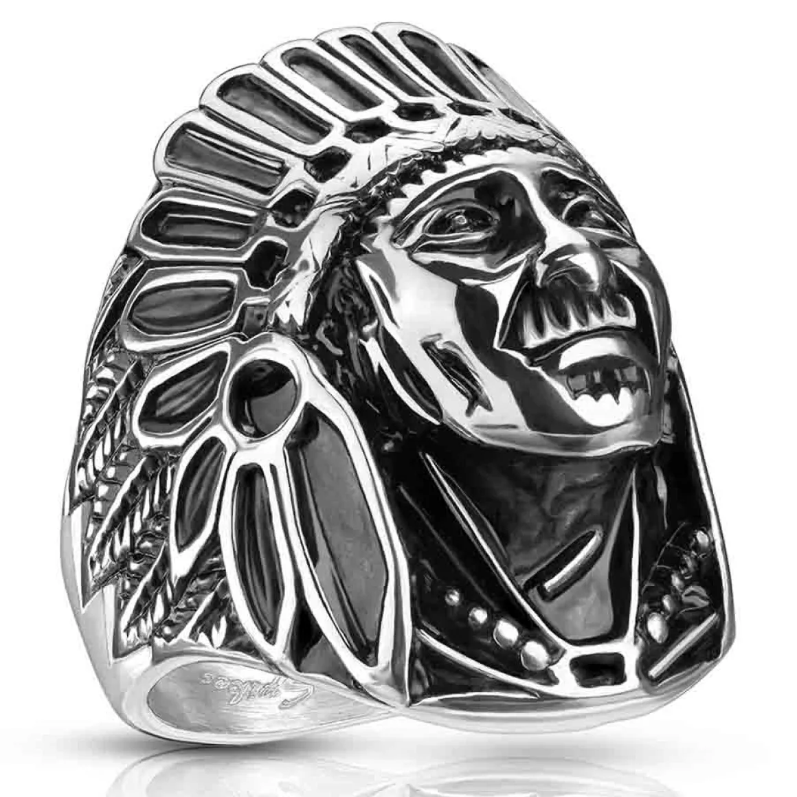 Oplev den uimodståelige Apache herrering i rustfri stål! Denne store, flotte indiansk-inspirerede ring er et must-have for enhver biker eller skull-elsker. Med sin sorte eller blanke farve tilføjer den et råt og stilfuldt touch til dit look. Mål ca. 2 x 3 cm på toppen. Gør dig klar til at rocke!