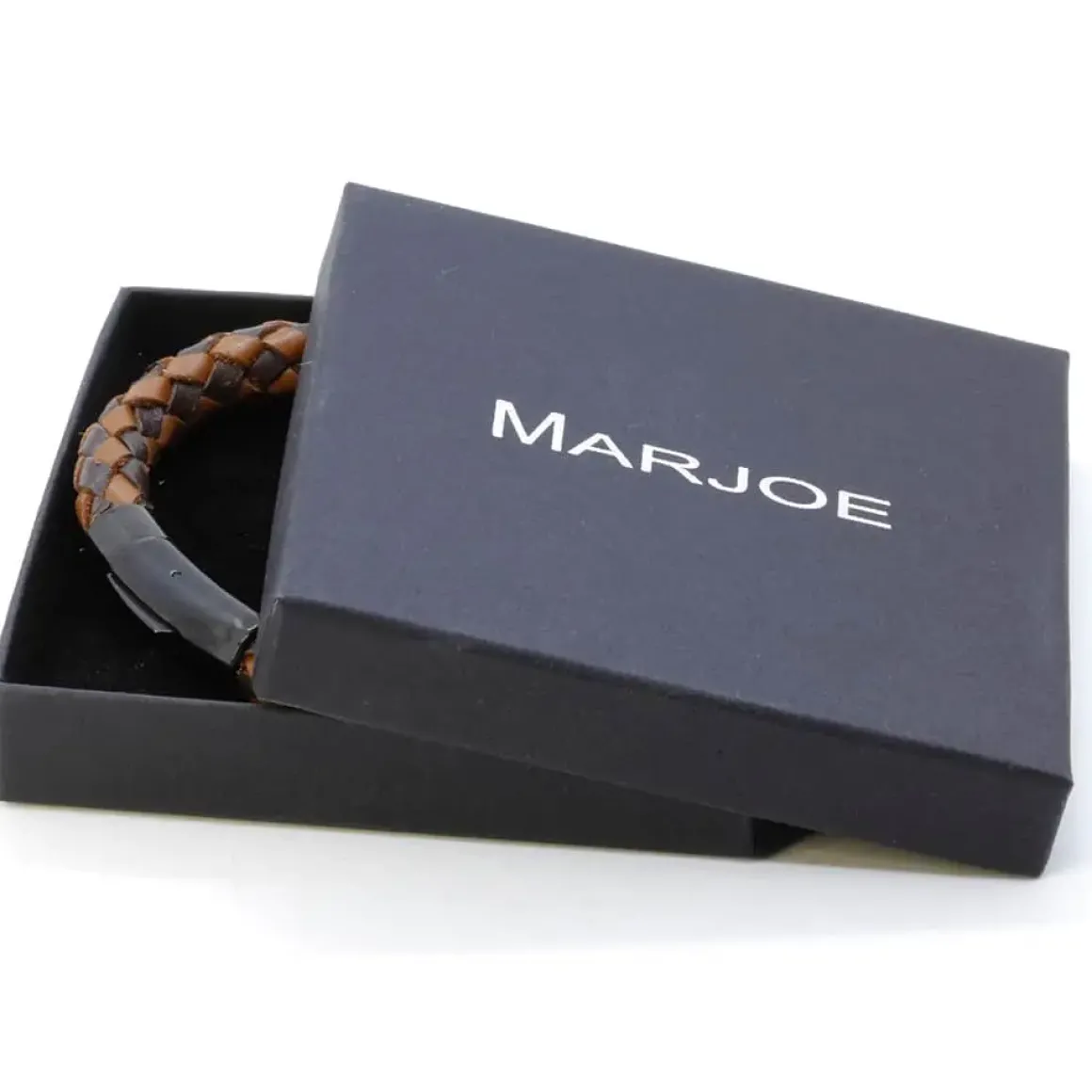 Læderarmbånd i 8mm kraftig bololæder og mørk og lys flettet. Armbåndet er meget maskulint og passer fint sammen til alle former for tøjdress, og så er der lås i mat stål. Du kan købe armbåndet i længderne fra 18-23 cm