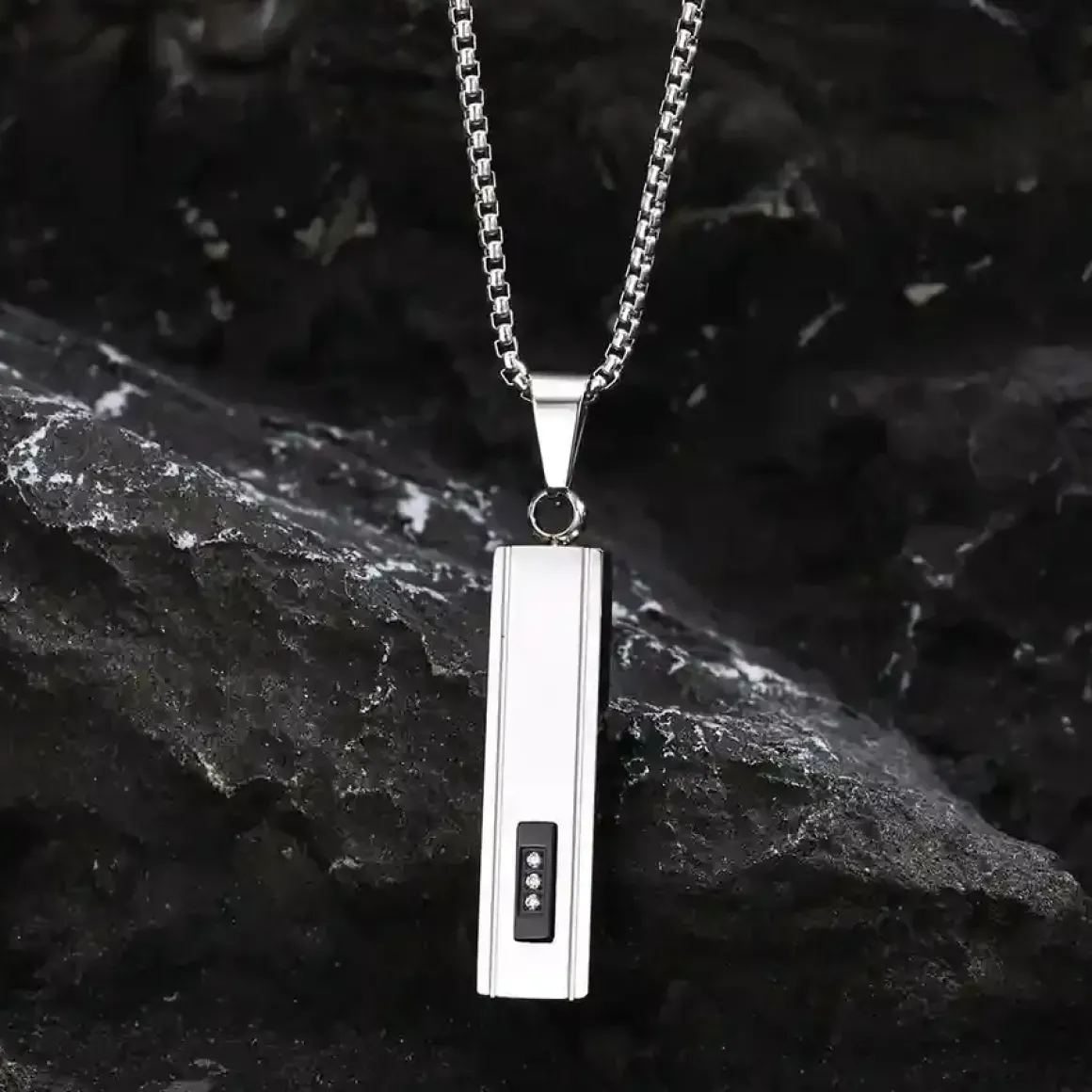 Denne halskæde til mænd kombinerer et minimalistisk design med et markant, maskulint udtryk. Den rektangulære bar pendant er fremstillet i slidstærkt rustfri stål og prydet med diskrete CZ-detaljer, som tilfører et eksklusivt look uden at virke prangende.