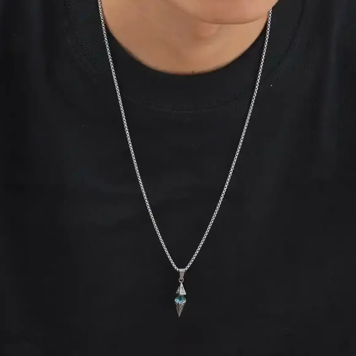 Vedhænget prydes af en smuk turkisgrøn cirkon, der giver smykket en helt særlig dybde og karakter.