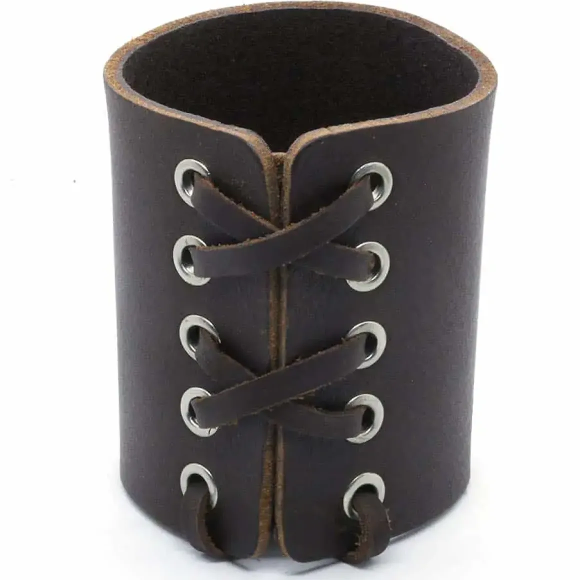 Bredt mørk brunkraftigt læderarmbånd med snører.