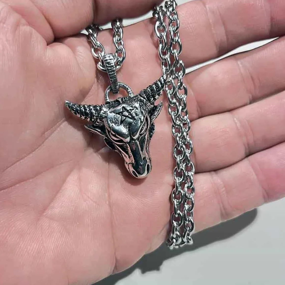Bull i rustfri stål med kæde 70 cm er et kraftfuldt herresmykke i blankt rustfrit stål. Perfekt til biker-looket med et skræmmende skull-design. Den 70 cm lange kæde kan nemt afkortes efter behov. Rustfrit stål.