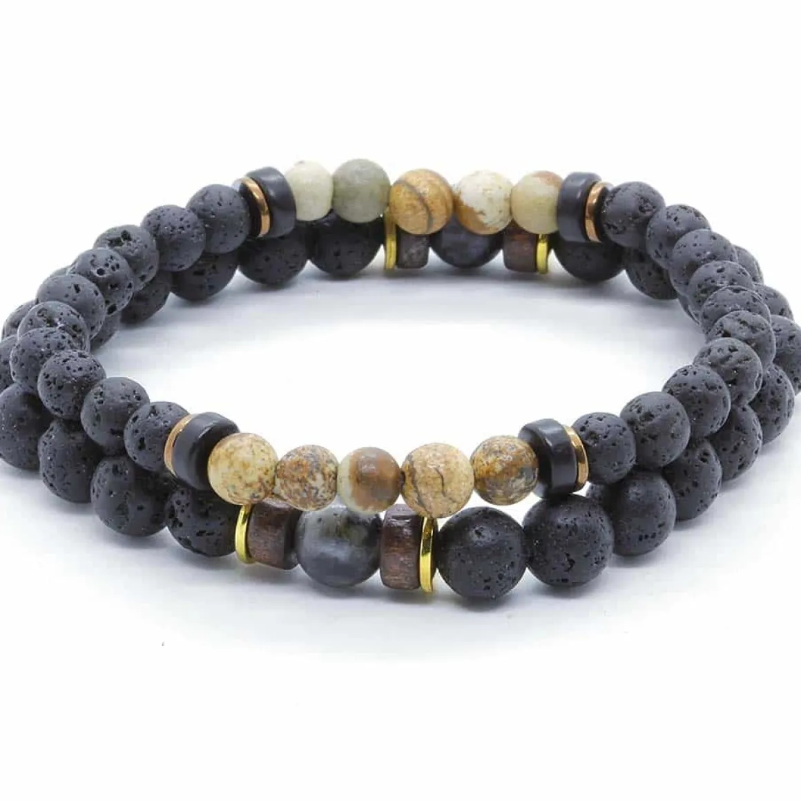 Lava, træ og edge stone perler med nogle forgyldte stålbeads i mellem.