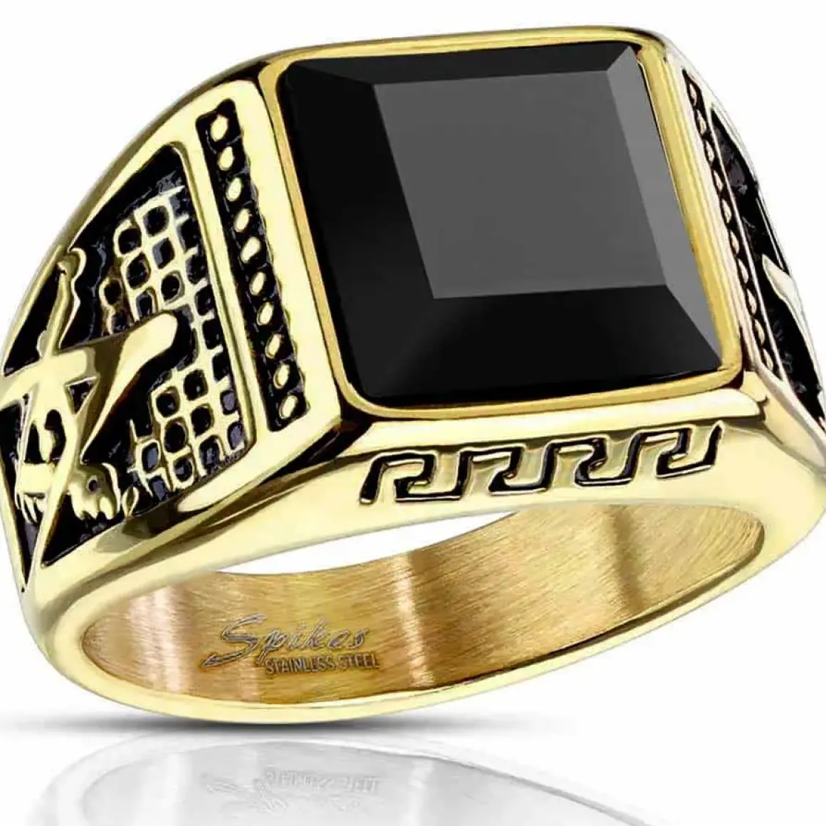 Flot forgyldt herrering i stål med sort onyx på 1 x 1 cm