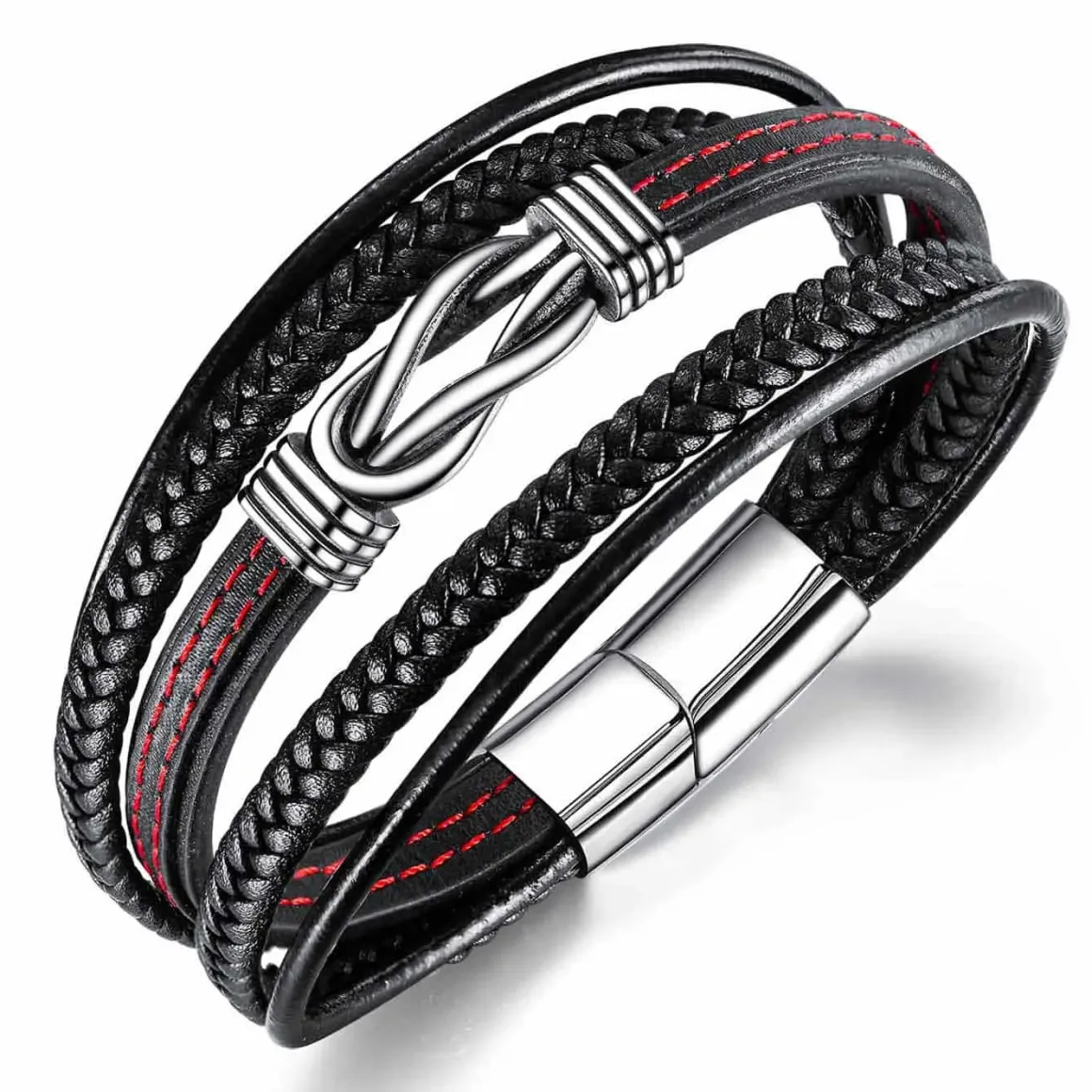 Få en fed og moderne stil med vores Fiberlæder armbånd med røde stik og rustfrit stål.