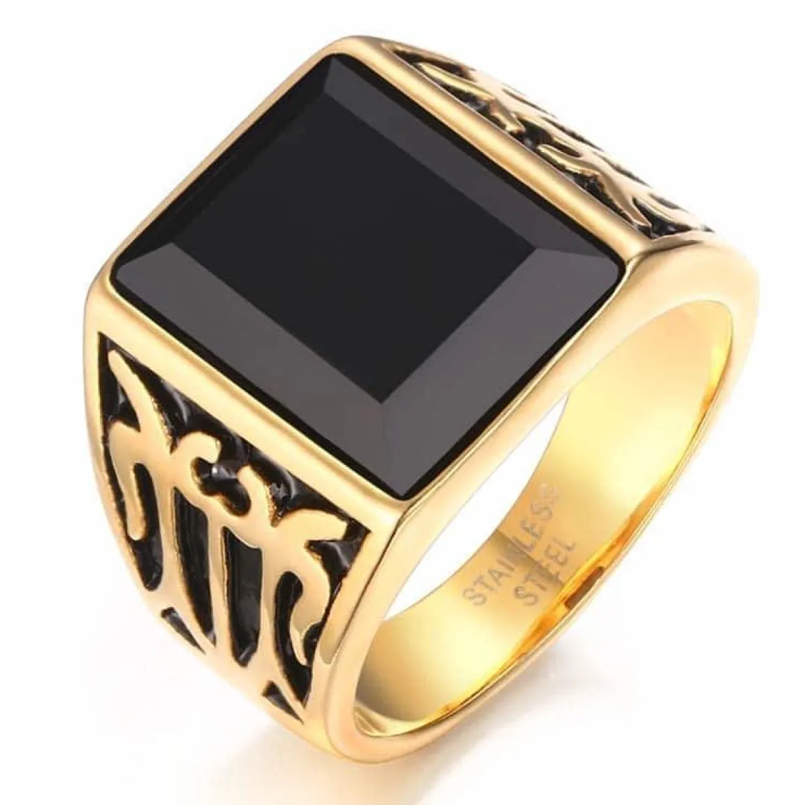 Denne flotte ring er udsmykket med en stor, sort agatsten på 1 x 1,5 cm.