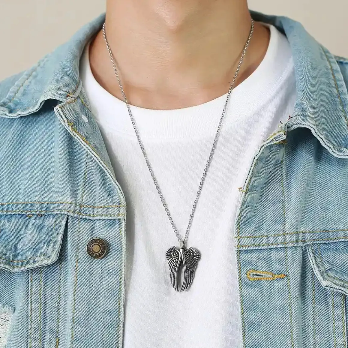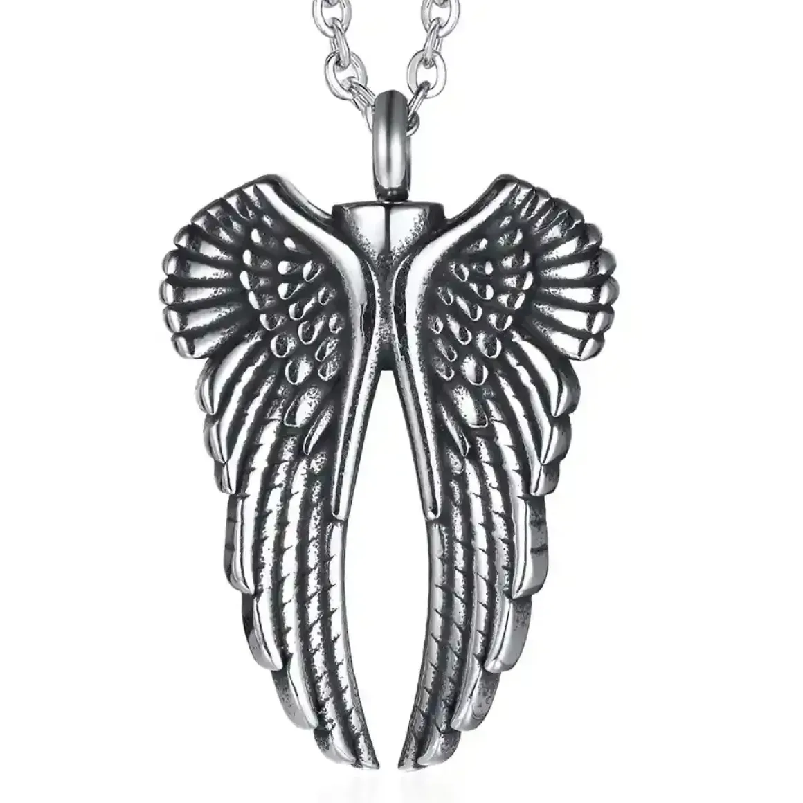 Maskulint halssmykke til mænd i rustfrit stål med en imponerende englevinge-vedhæng, der symboliserer styrke, frihed og beskyttelse.