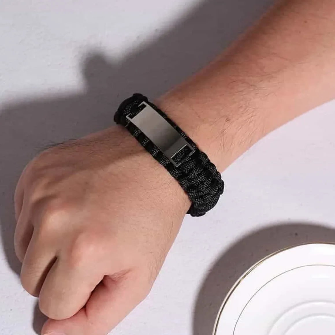 Sort kraftigt bomuldsarmbånd knyttet og med matteret stålplade.