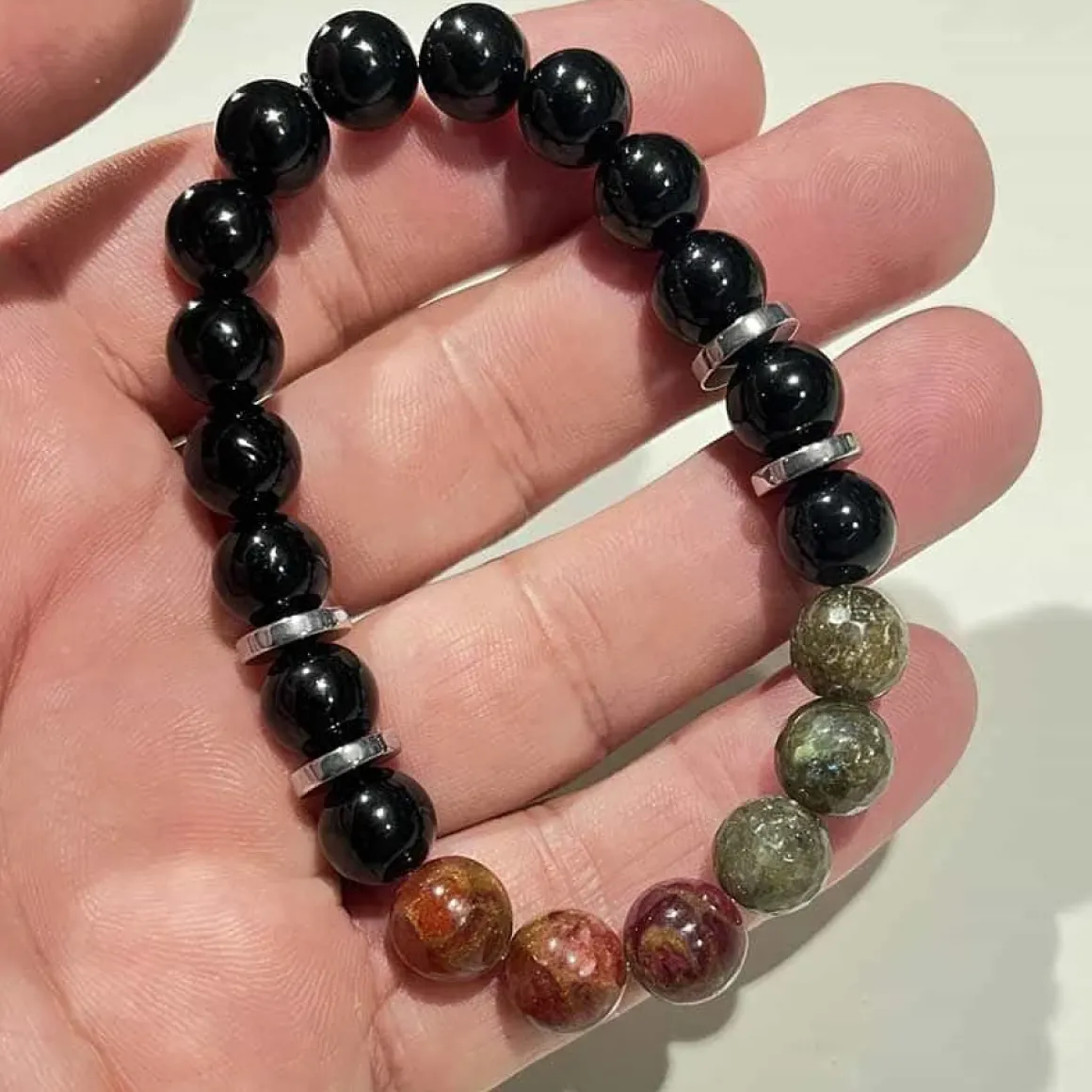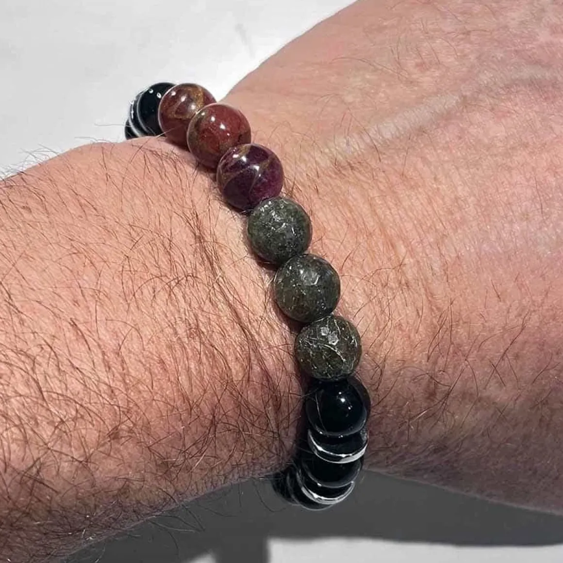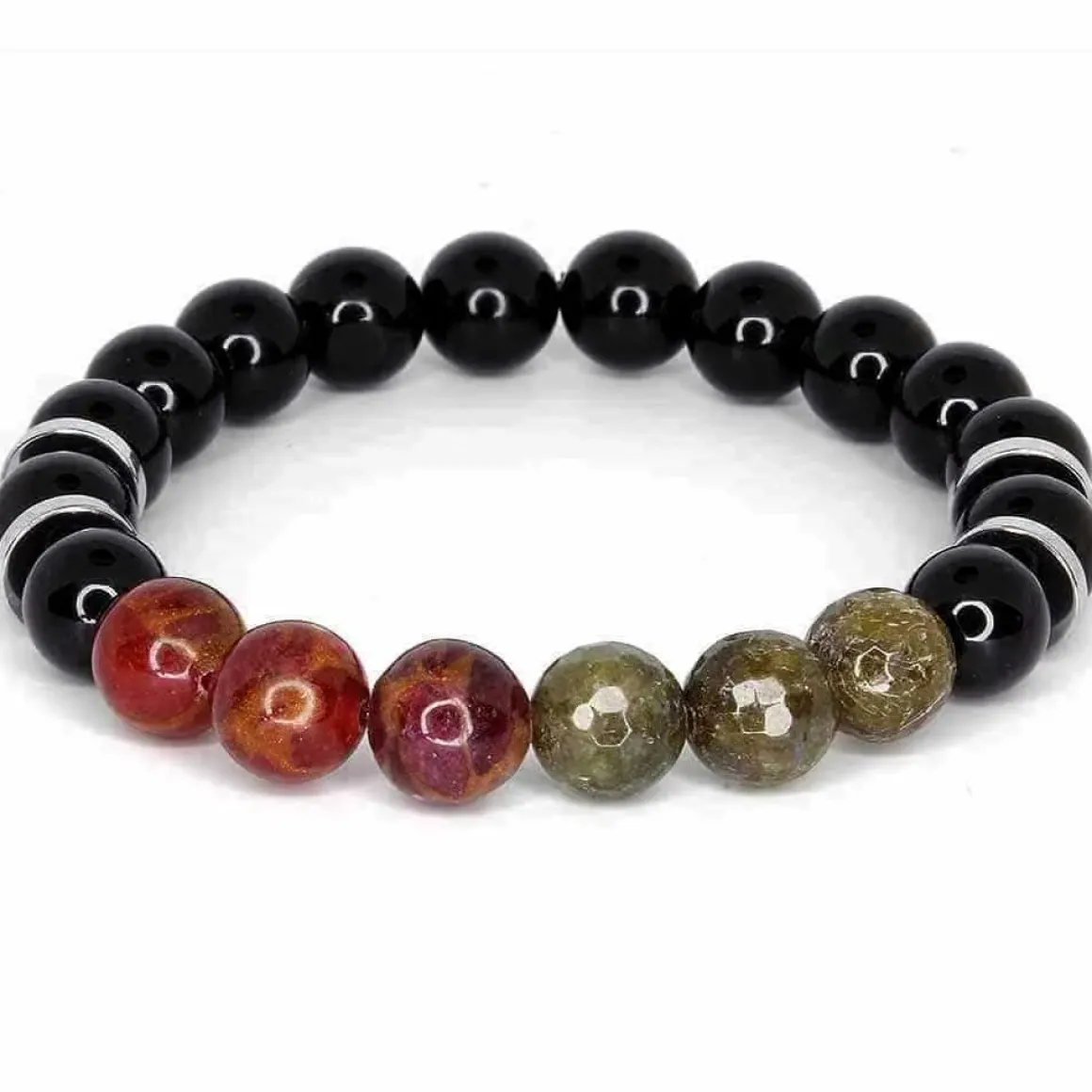Få et elegant og stilfuldt look med vores Larvik perlearmbånd i 10mm perle størrelse. Armbåndet er lavet af naturlige perler og har en smuk grøn Larvikite faceteret sten, rød Lapiz og sort Obsidian.