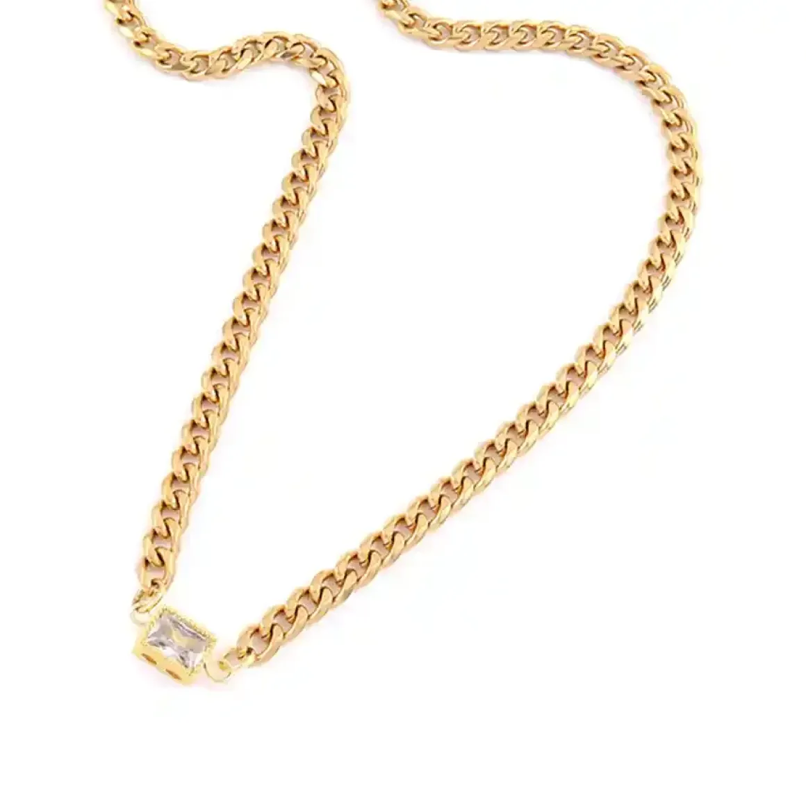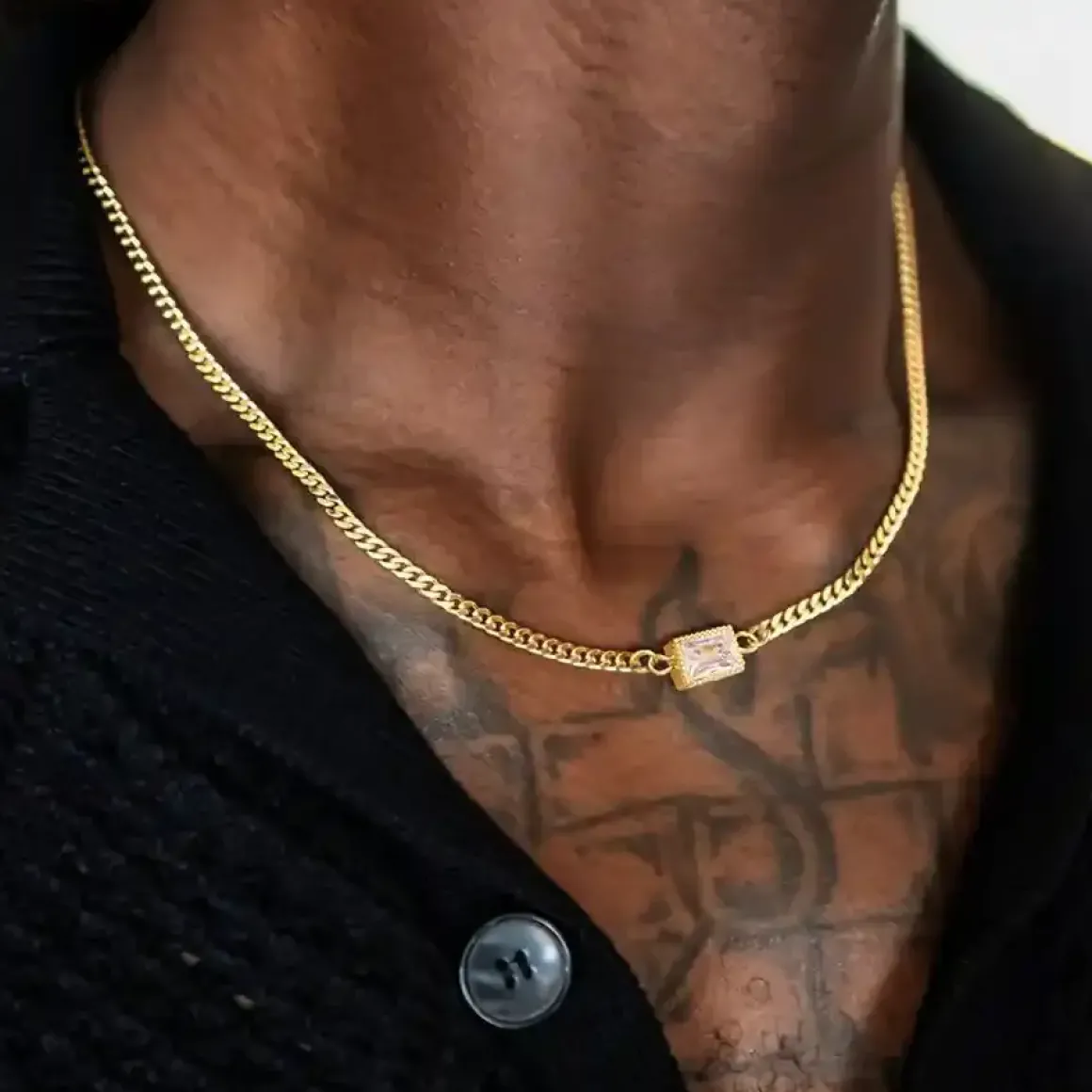 Golden Link CZ halskæde til mænd er fremstillet i forgyldt rustfrit stål med en elegant firkantet CZ sten som centrum.
