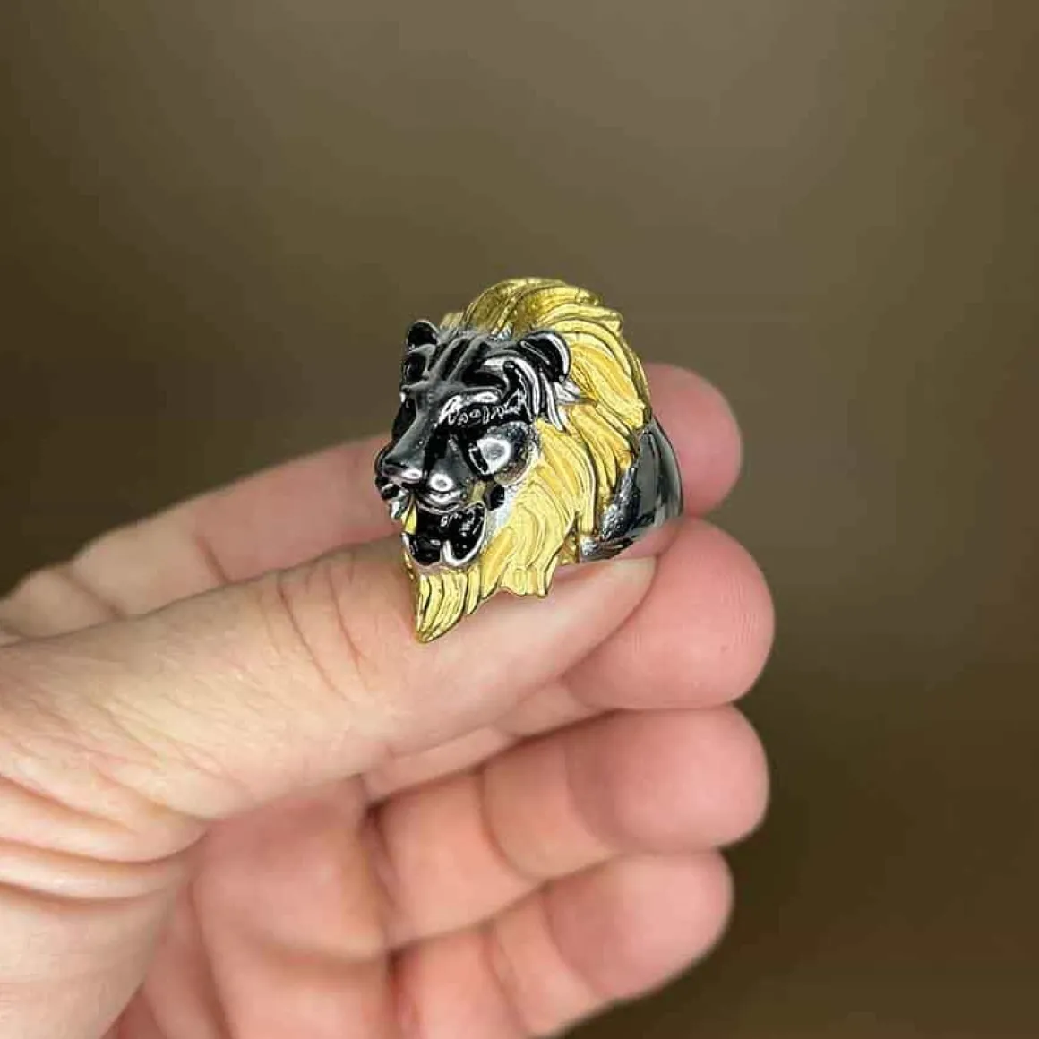 En så fed bikerring med forgyldt løvehoved i massiv rustfrit stål.