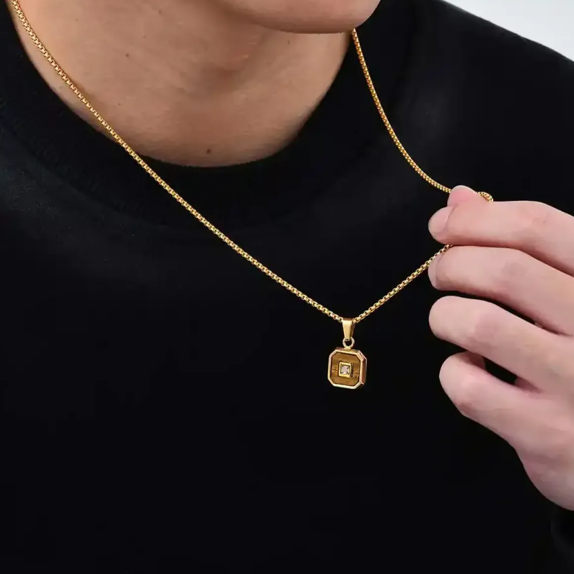 Den 60 cm lange kæde og det diskrete vedhæng (1,3 x 1,3 cm) tilføjer et tidløst touch til enhver herregarderobe.