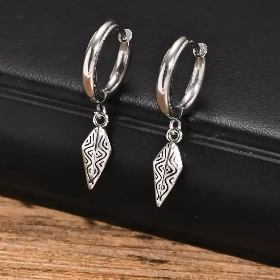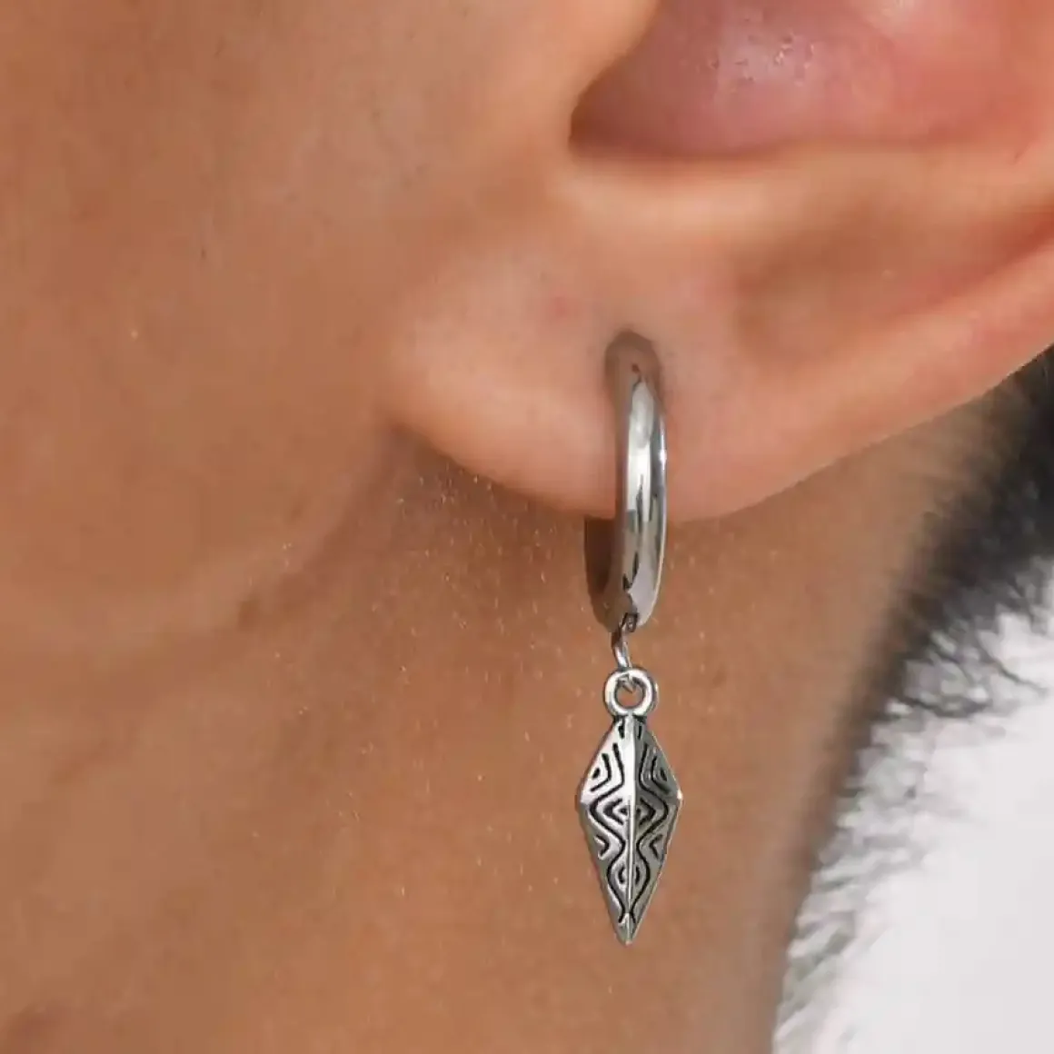 Fremhæv din stil med Nordic Edge Hoop, en rå og maskulin herre ørering i rustfrit stål, designet med et let hængende nordisk-inspireret vedhæng. De rene linjer og det symbolske mønster giver et skarpt, vikingeagtigt udtryk, der både fungerer til hverdagslook og et mere kantet street-stil outfit.