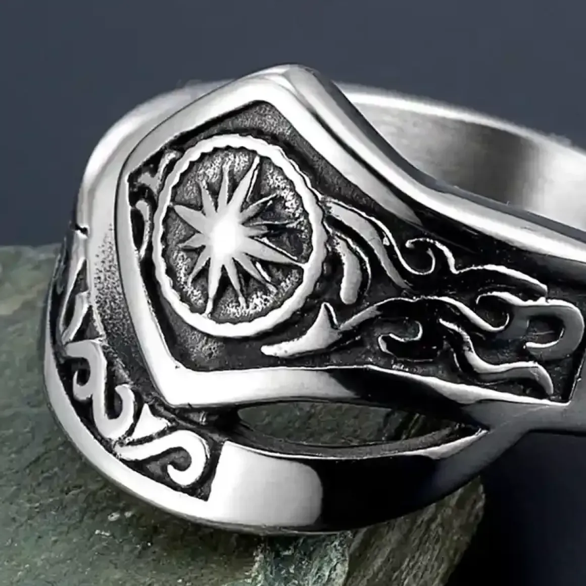 Det centrale symbol forestiller en nordisk stjerne – et tegn på retning, styrke og indre kompas. Stjernen har historisk været brugt som vejviser og symbol på beskyttelse. Kombineret med de ornamenterede mønstre omkring, får ringen et udtryk inspireret af nordisk mytologi og klassisk herresmykke-design.