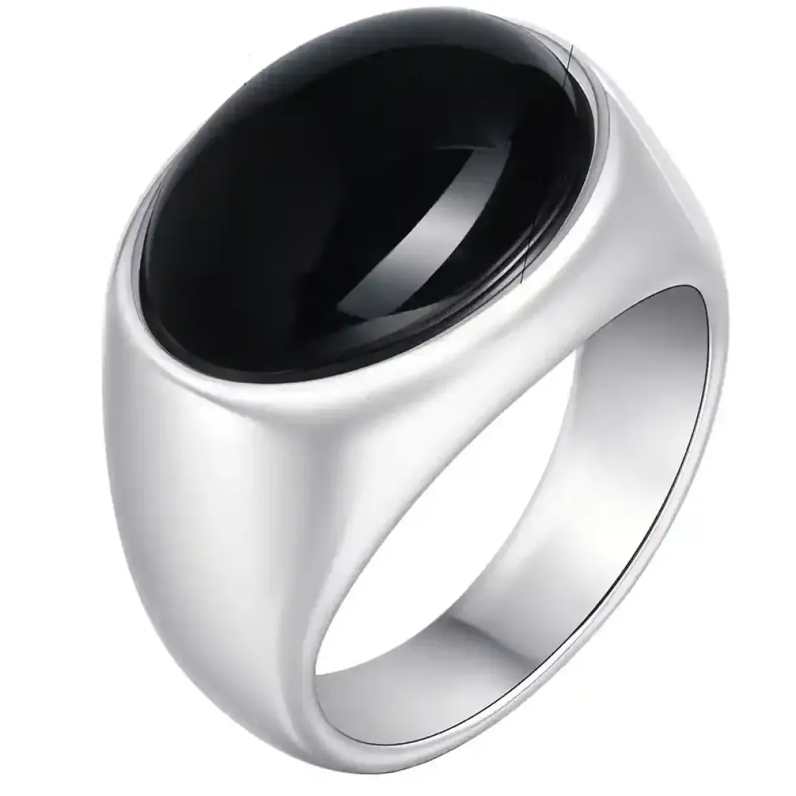Kraftfuld signet ring til mænd i rustfrit stål med en oval sort sten, der udstråler styrke og tidløs elegance.
