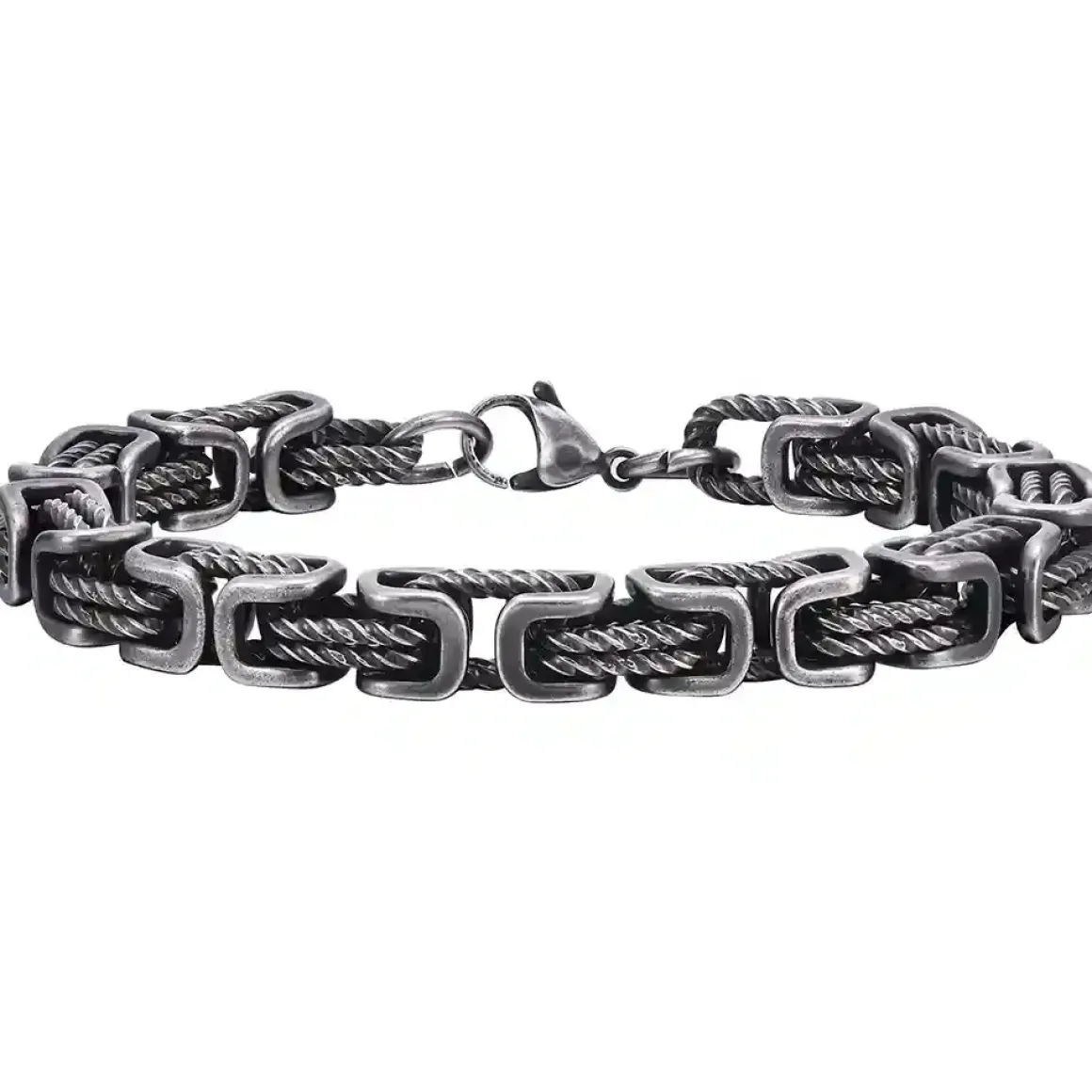 Dette herrearmbånd i oxyderet rustfrit stål er designet til manden, der vil have et markant look uden at gå på kompromis med kvalitet. Den kraftige 8 mm kæde kombinerer flettede stålkabler med kantede led, som giver armbåndet et industrielt og maskulint udtryk.