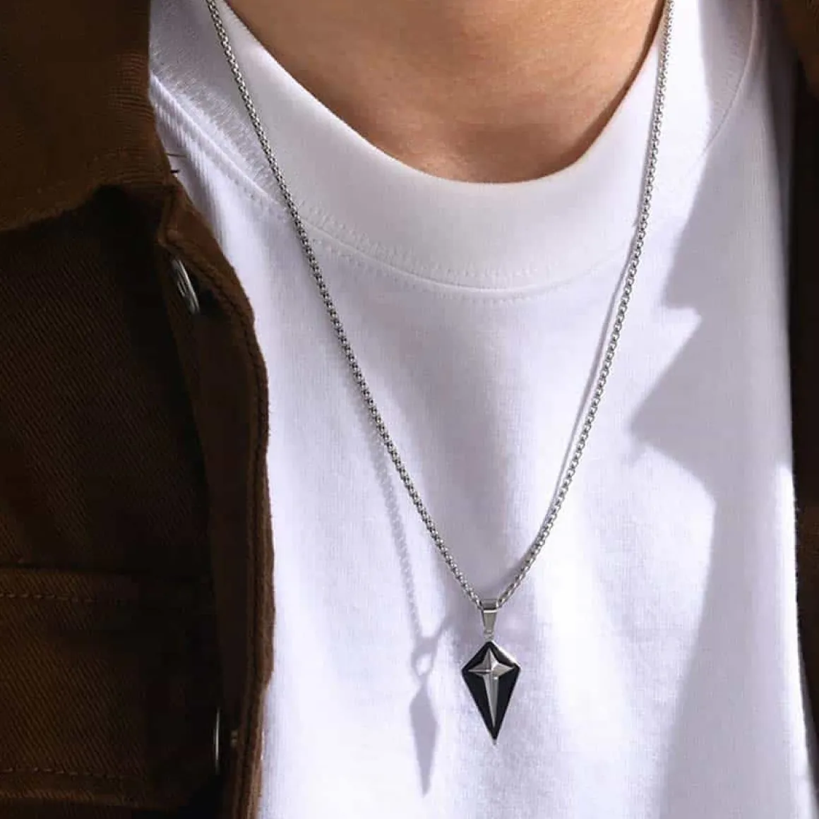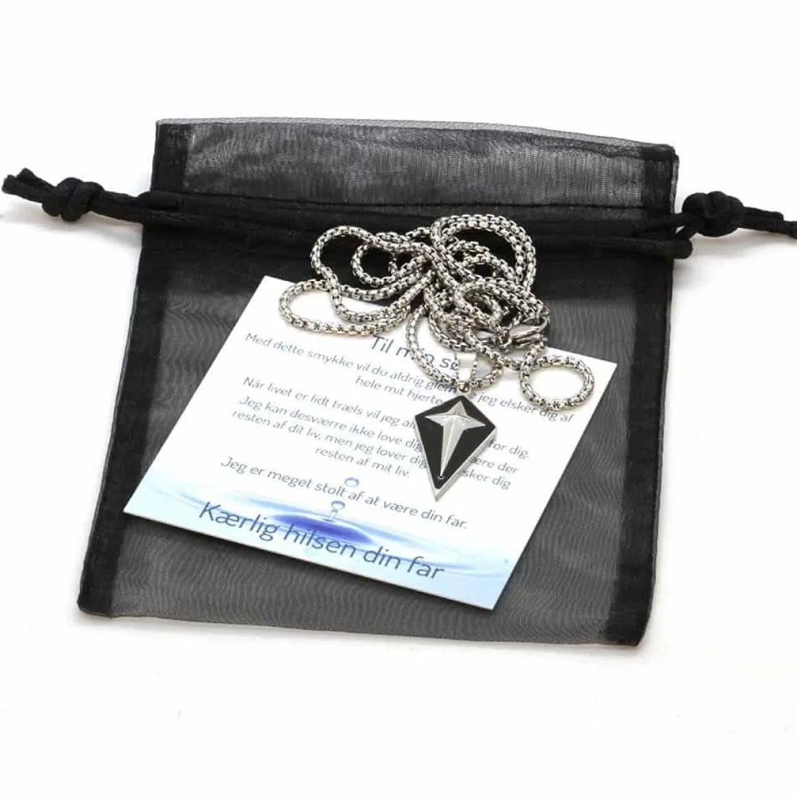 Kæden er 60 cm og vedhænget måler 1,5 x 3 cm.