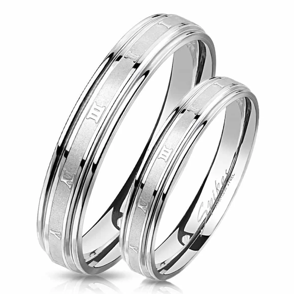 Forlovelsesring eller vielsesring i ædelstål og matbruch med romertal.
