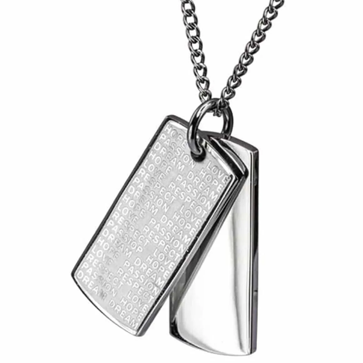 Halssmykke i blank rustfrit stål med tekst.