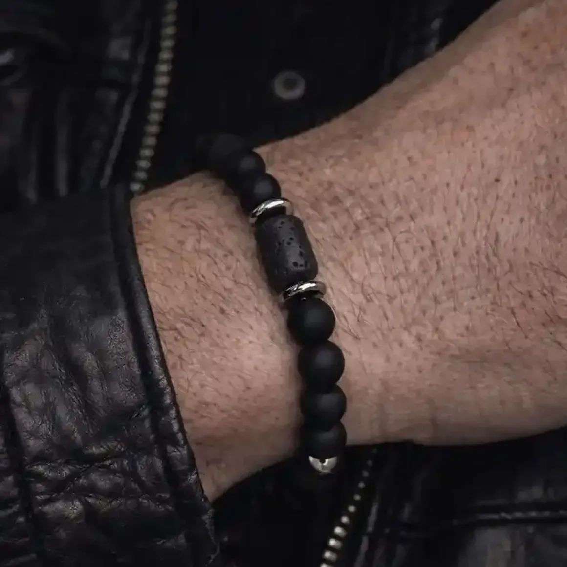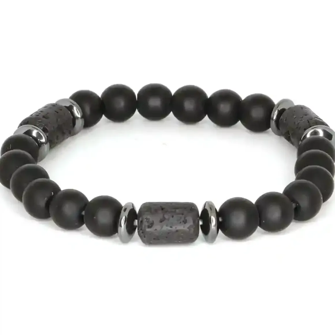 Sort perlearmbånd til mænd kombinerer 8mm blackstone-perler, rå lavaperler og blanke hematitdetaljer i et stilrent og maskulint design. Kontrasten mellem de matte sten og de polerede metalperler giver armbåndet et eksklusivt, men råt udtryk – perfekt til den moderne mand.