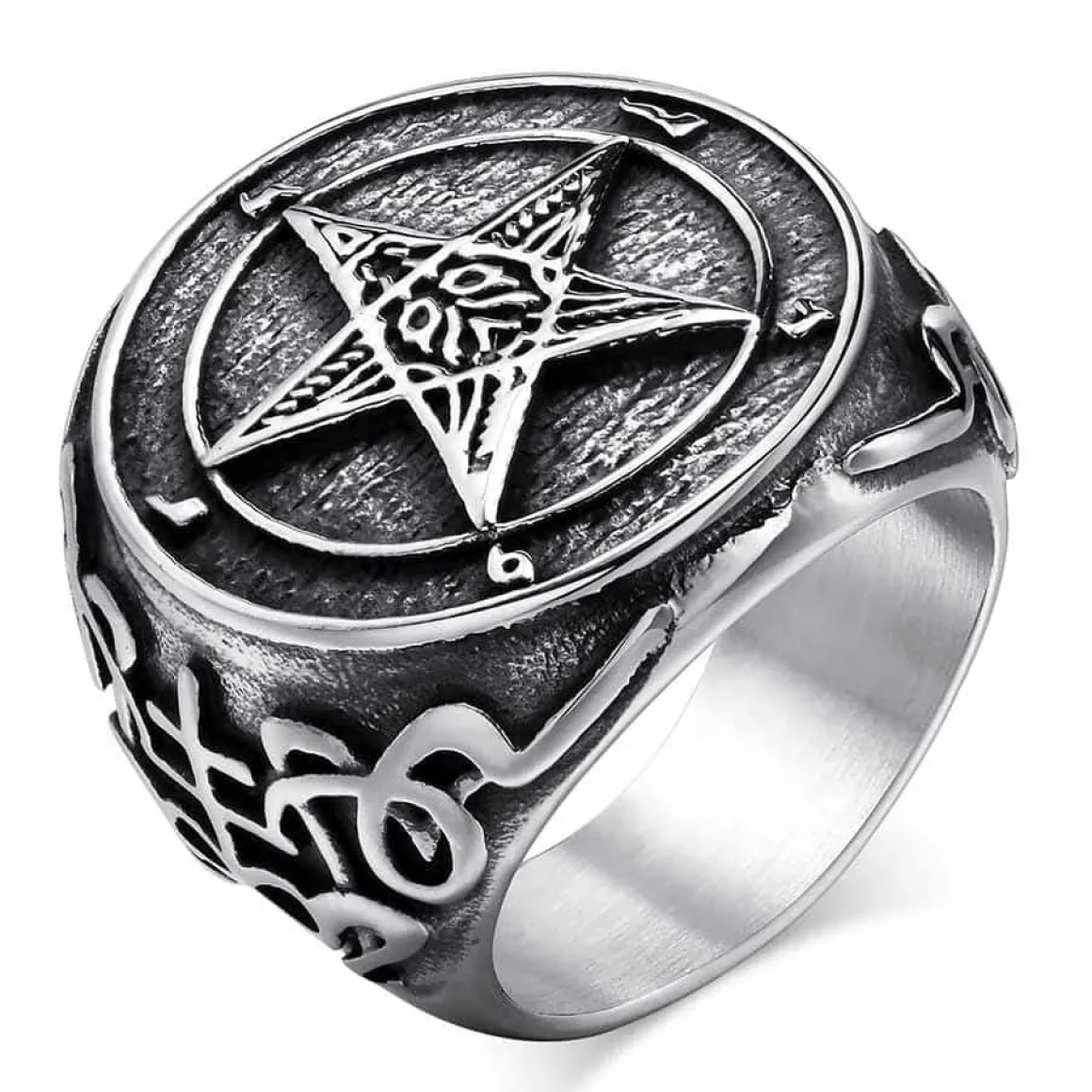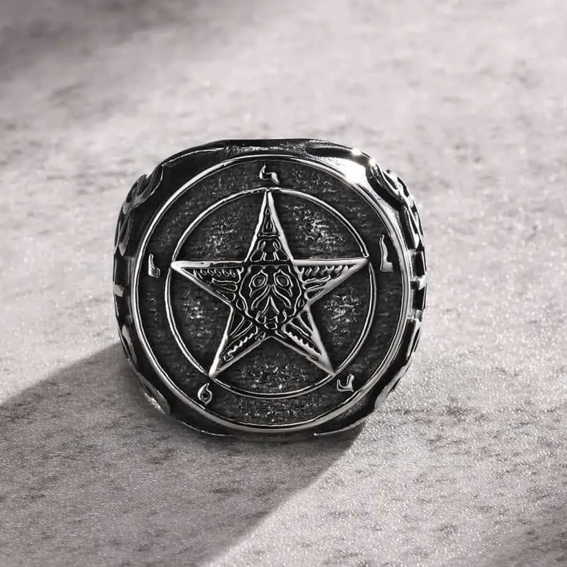 Få et cool udseende med denne flotte stor herrering i rustfri stål med stjerne script. Ringen har en diameter på 2,5 cm og passer perfekt til biker-stilen. Den sorte farve og det rustfri stålmateriale giver et robust look. Gør din stil unik med denne trendy ring.