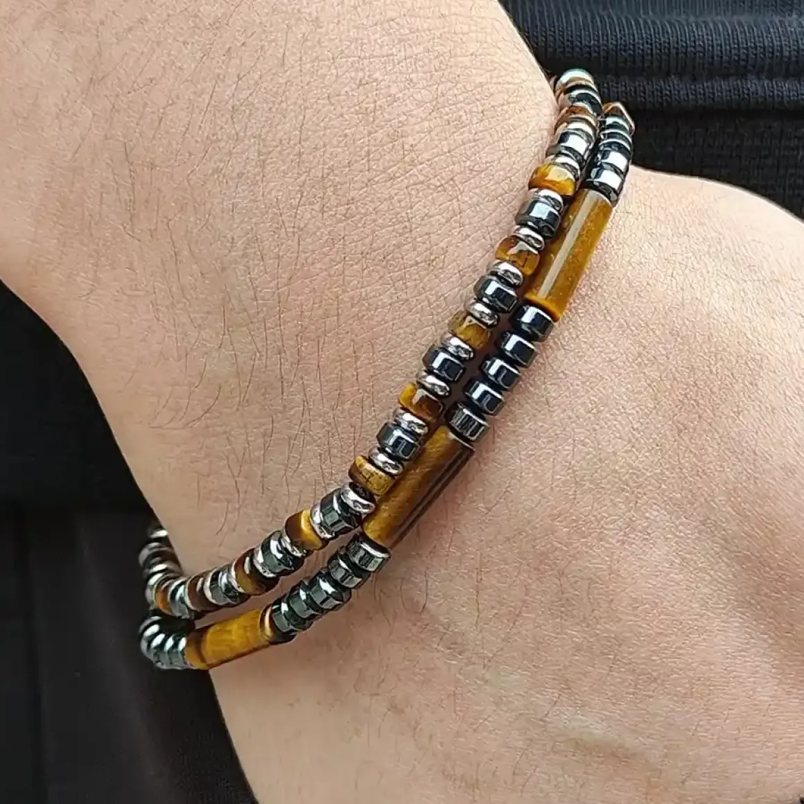 Sættet indeholder to håndfremstillede armbånd med autentiske Hamatit og tigerøje-perler, der tilføjer et strejf af rå maskulinitet.