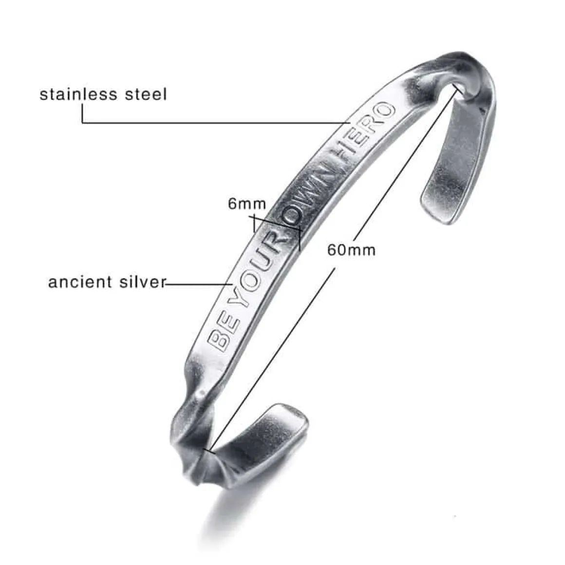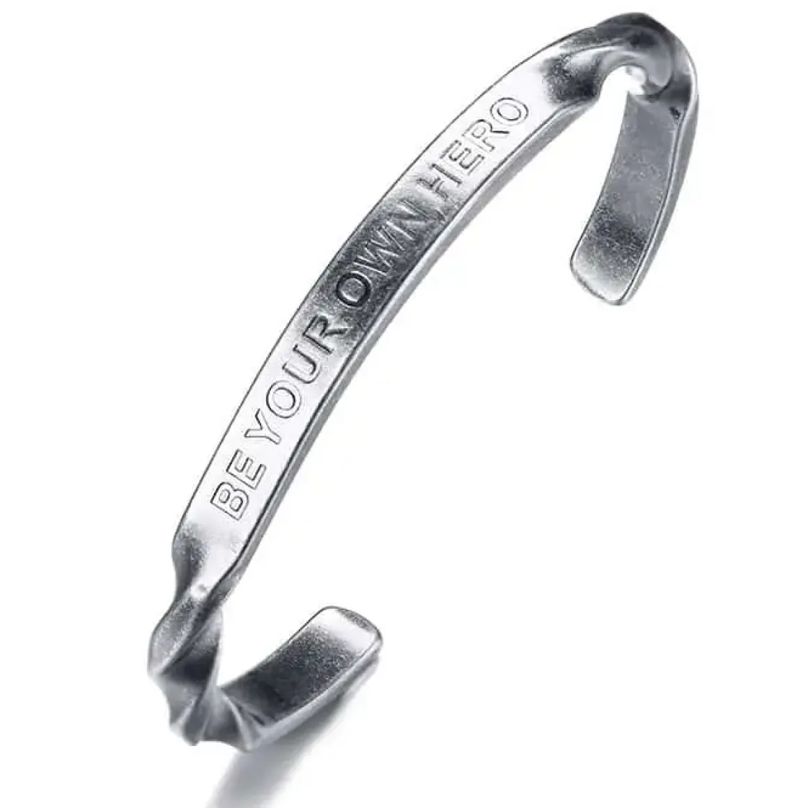 Lækket armbånd i vredet oxyderet stål med tekst.