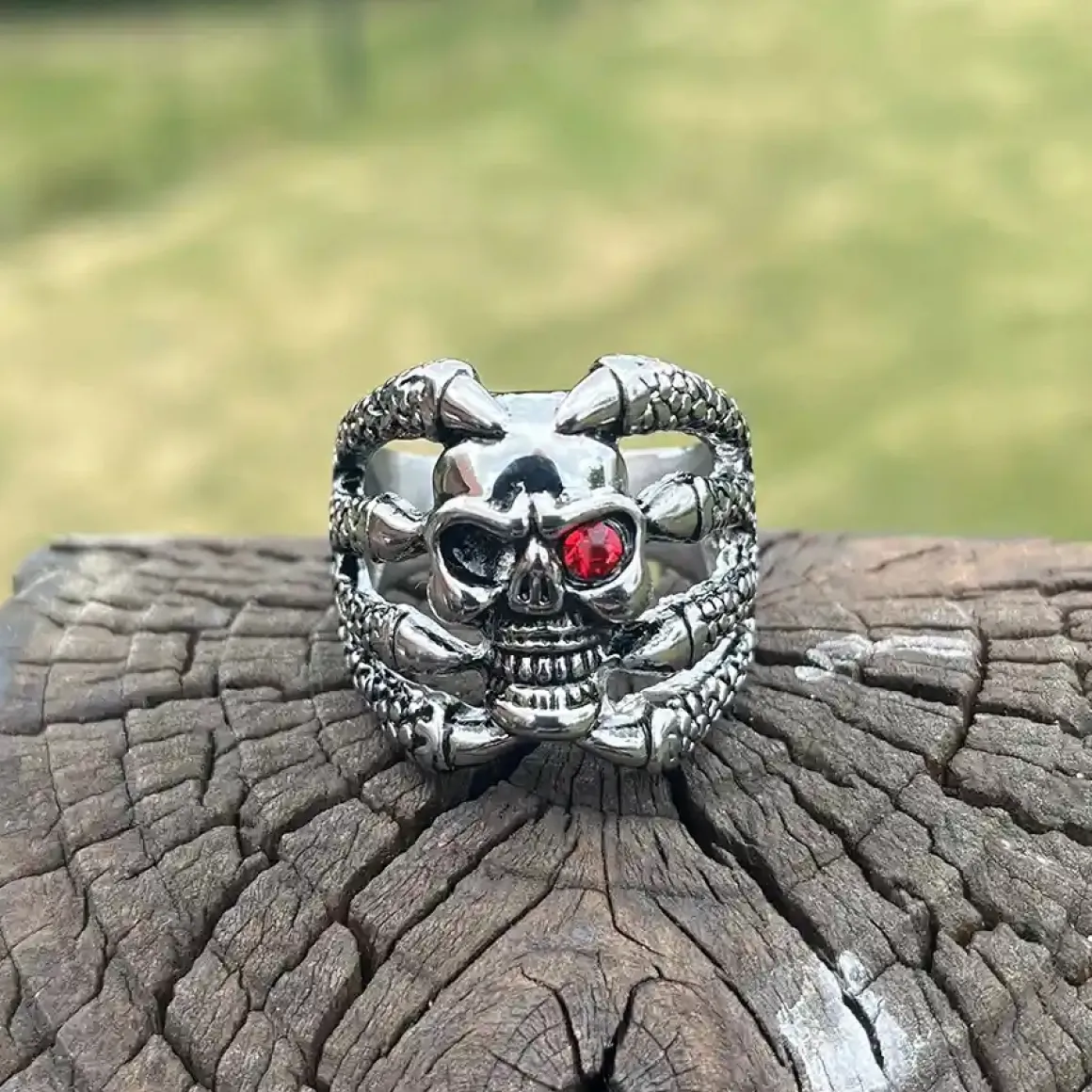 Sjældent set design i skull ringe, og her er den med stor rød CZ sten.