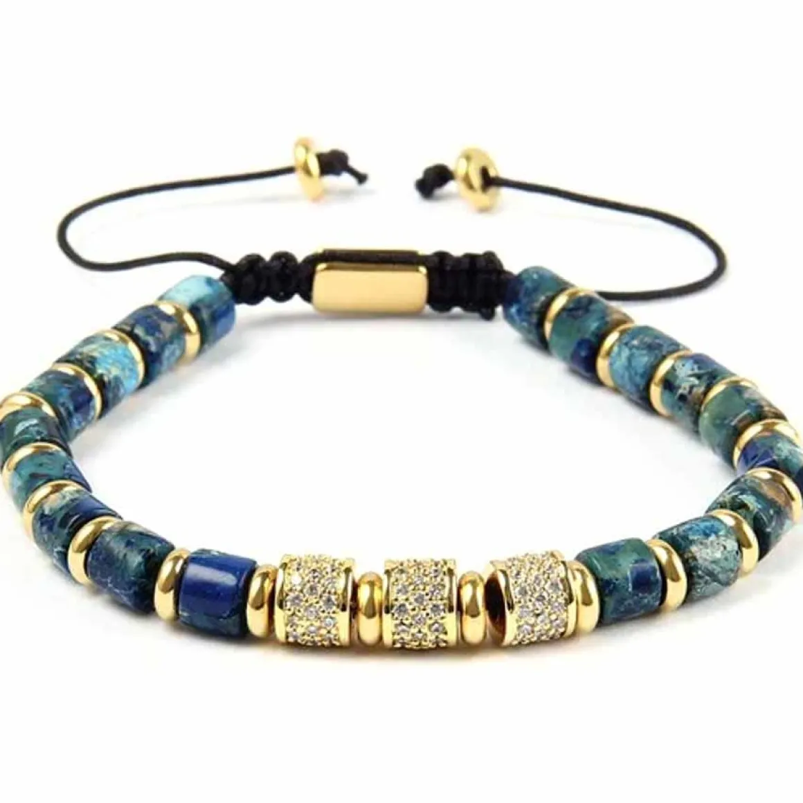 7mm grønblå perler og forgyldte beads i rustfri stål med CZ sten.
