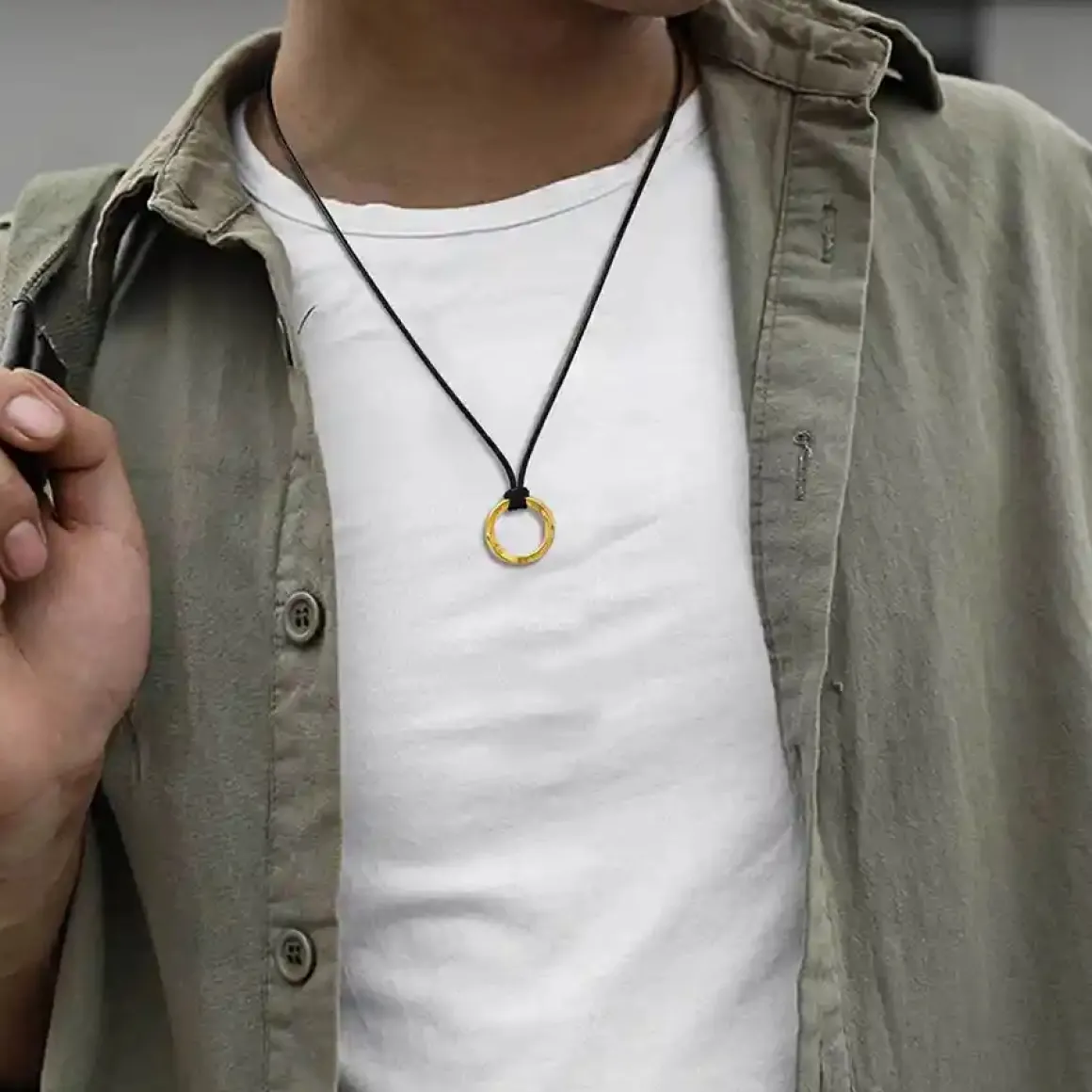 Et moderne herresmykke, der kombinerer gyldent metal og mørkt læder i perfekt balance mellem styrke og stil.