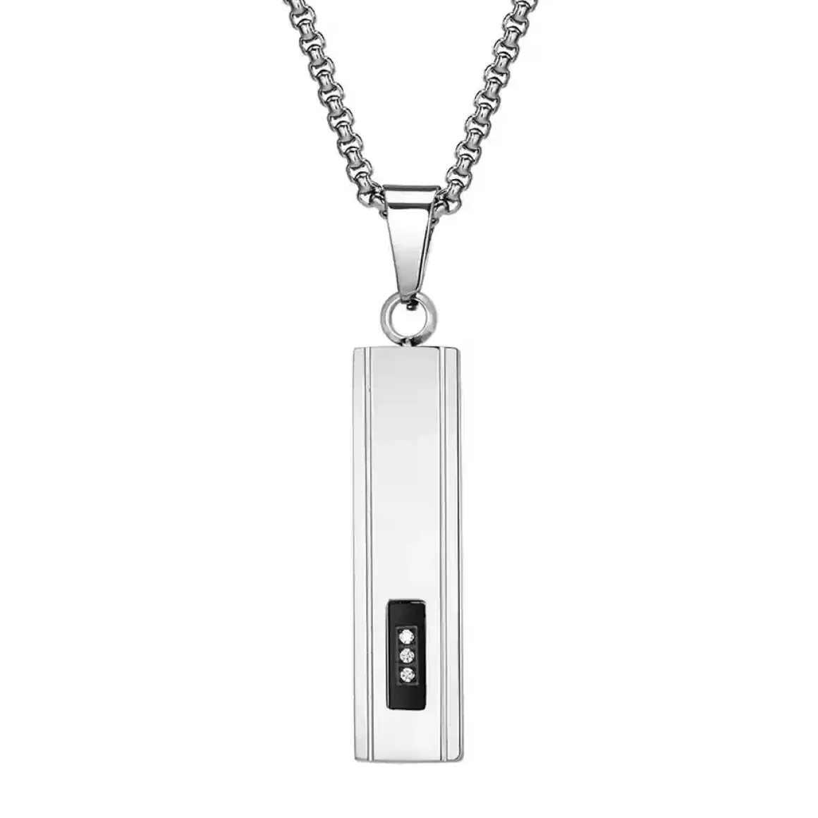 Denne halskæde til mænd kombinerer et minimalistisk design med et markant, maskulint udtryk. Den rektangulære bar pendant er fremstillet i slidstærkt rustfri stål og prydet med diskrete CZ-detaljer, som tilfører et eksklusivt look uden at virke prangende.