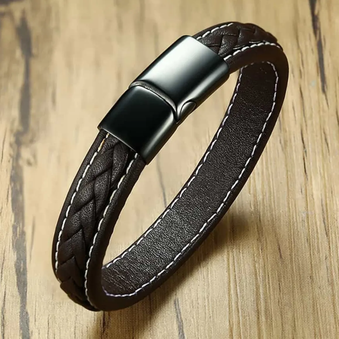 Brunt Imt. læderarmbånd med stållås i højpolleret blackcoat.