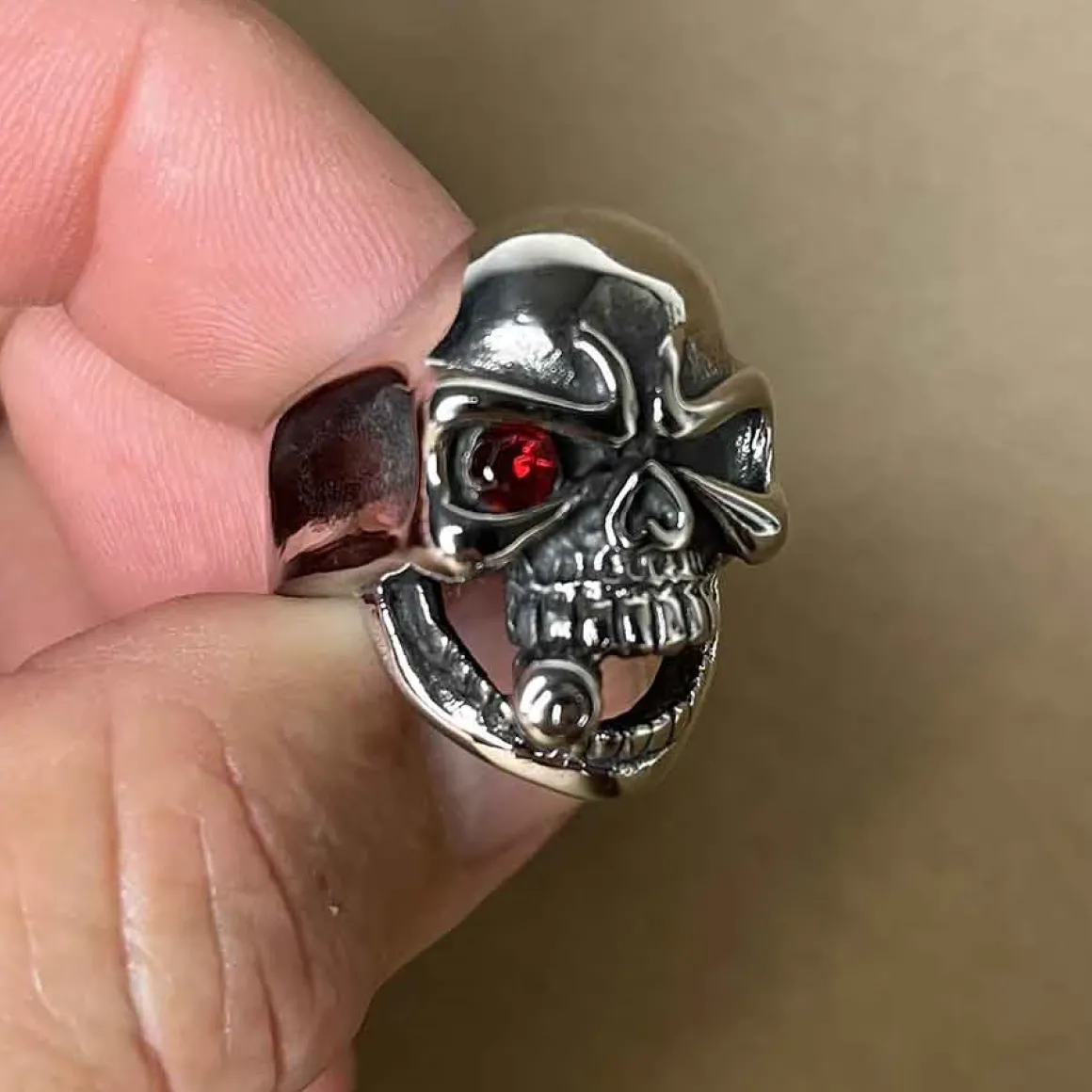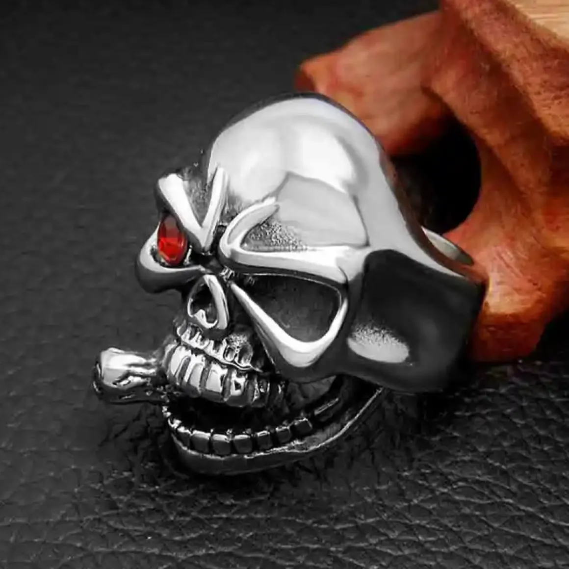 Denne rustfri stålskullring i blank med rød sten er perfekt til bikerstilen. Med et dødshoved, der ryger en cigar, er denne ædelstålring en ægte skullring. Tilføj lidt kant til dit look med denne stilfulde og holdbare ring. Passer perfekt til enhver biker eller skull-elsker.