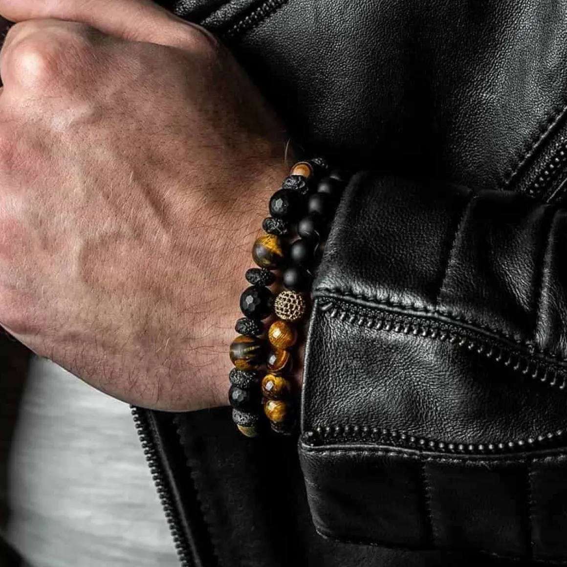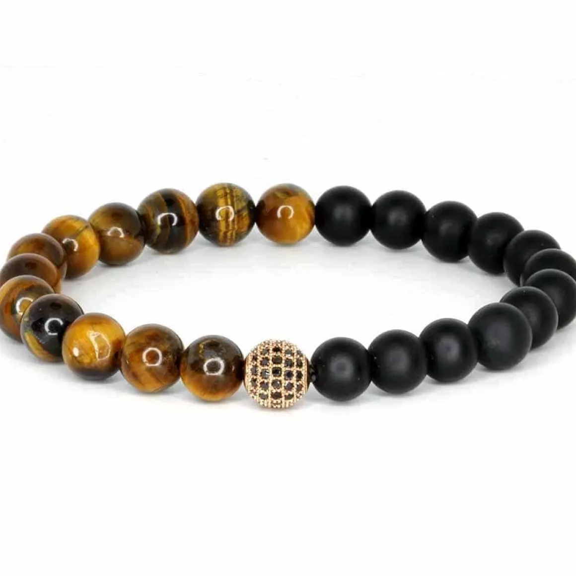 Eduard perlearmbåndet Tigereye og Blackstone er et stilfuldt herrearmbånd, der består af 8 mm perler på elastik.