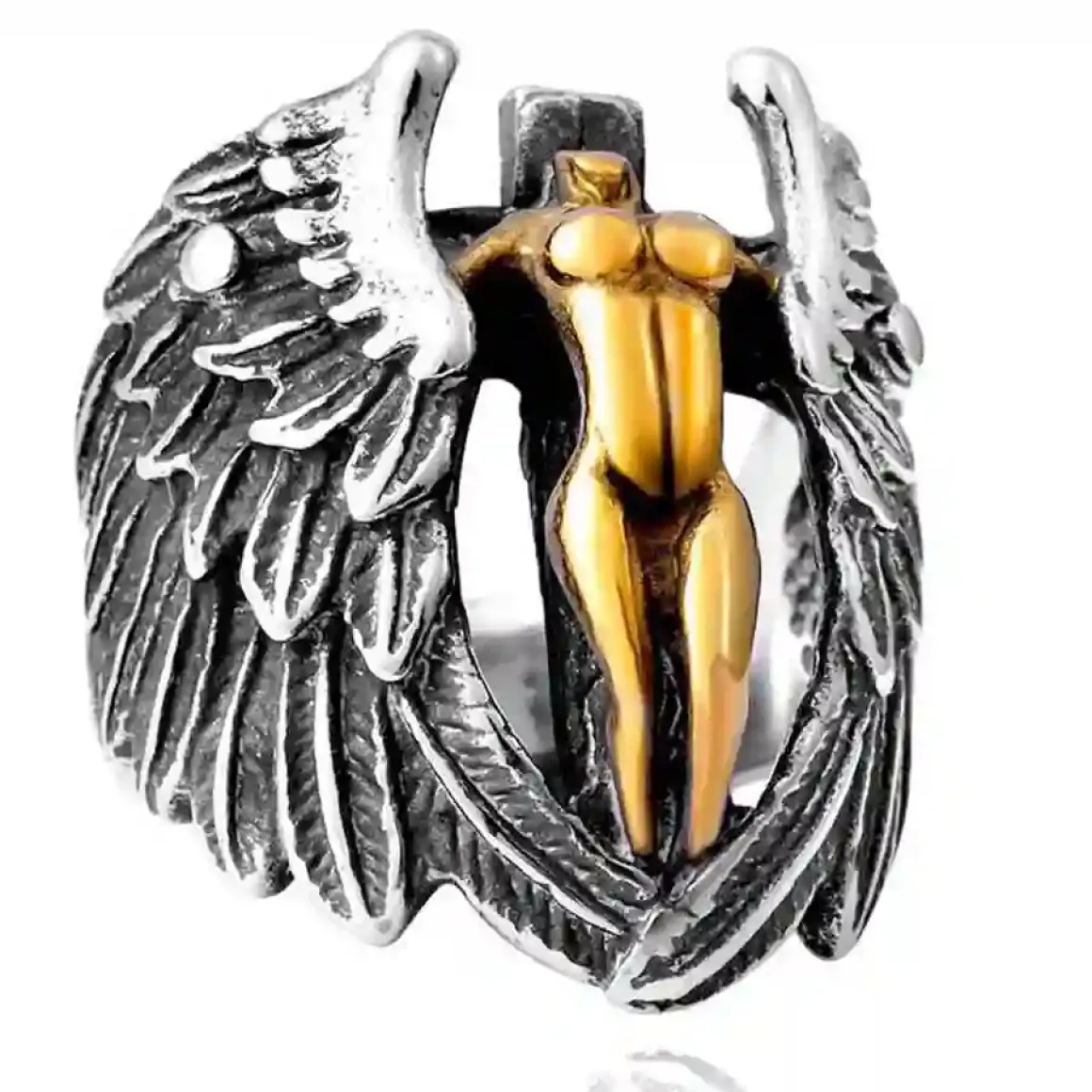 Denne fantastiske bikerring til mænd er lavet af rustfrit stål og har en forgyldt kvinde i midten. Den sorte og gyldne farve kombineres elegant og giver et blankt og stilfuldt udseende. Perfekt til enhver biker, der ønsker at tilføje lidt ekstra glamour til sit look. Køb den i dag og bliv en ægte fashionista på vejen!