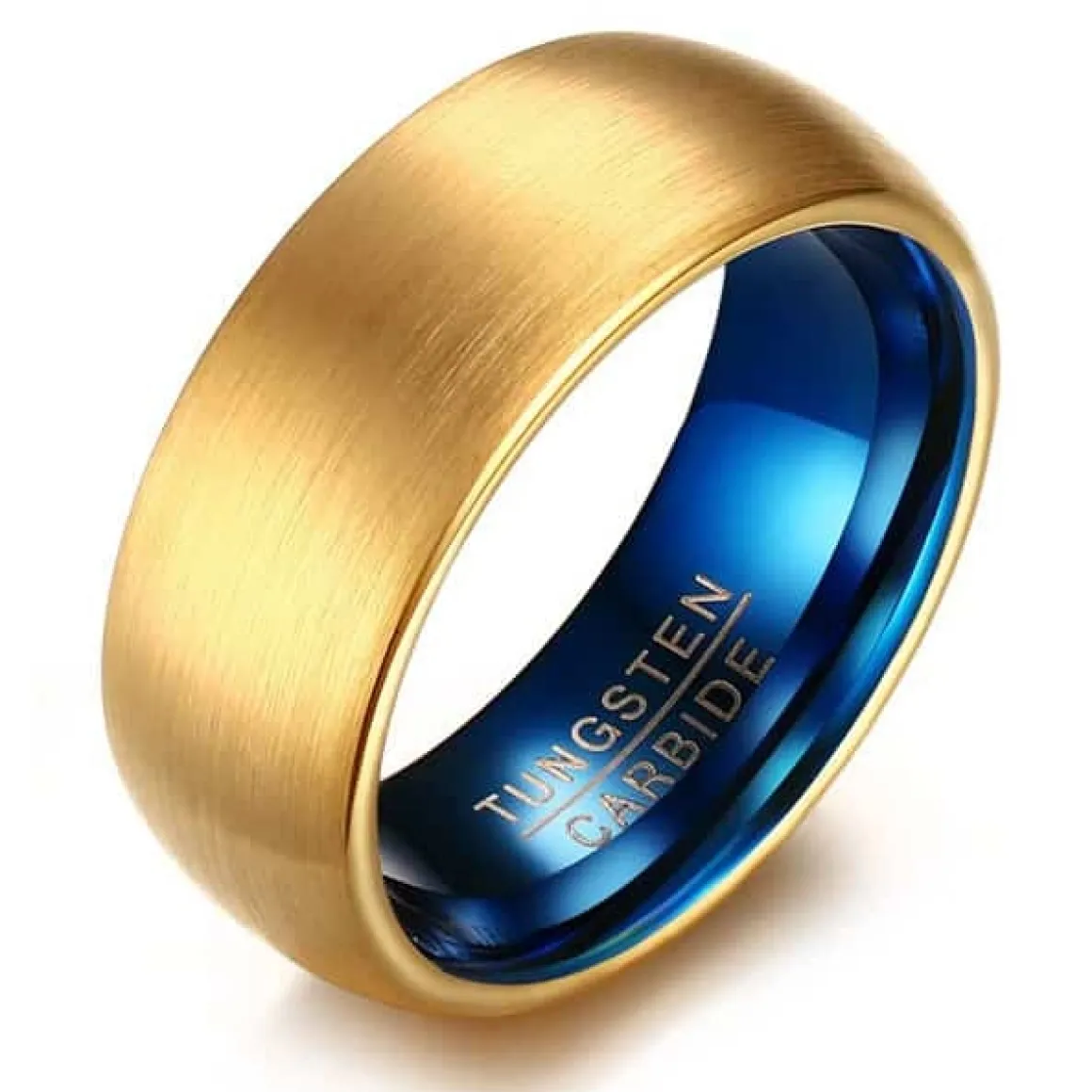 Lækker tungstenring med bluecoat på indersiden og matteret forgyldt på ydersiden.