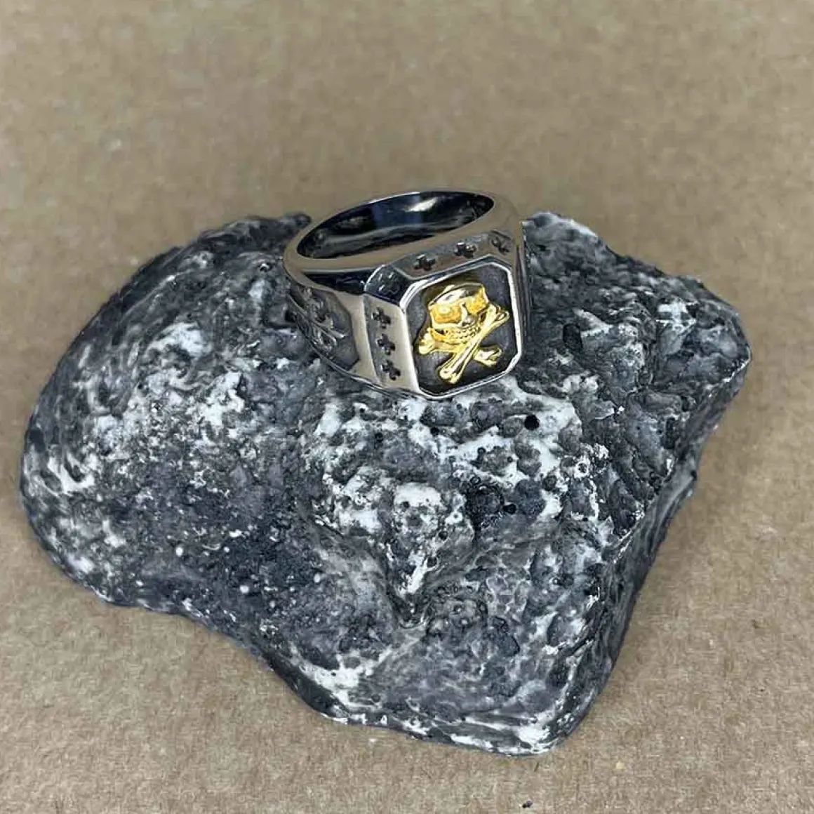 Flot ring i massivt rustfri stål med forgyldt skull.