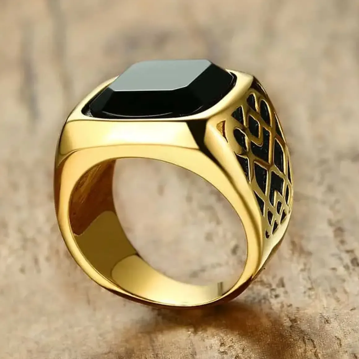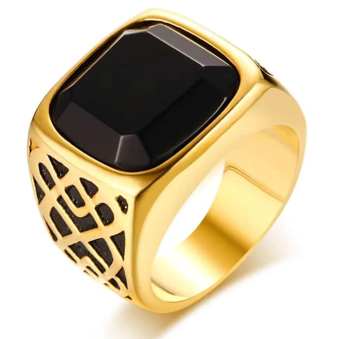 Flot stor herrering i IP forgyldt rustfri stål med sort agat sten.