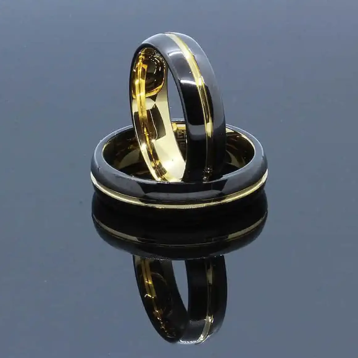Meget flot stilfuld forlovelsesring i Tungsten med matteret blackcoat og forgyldt stribe.