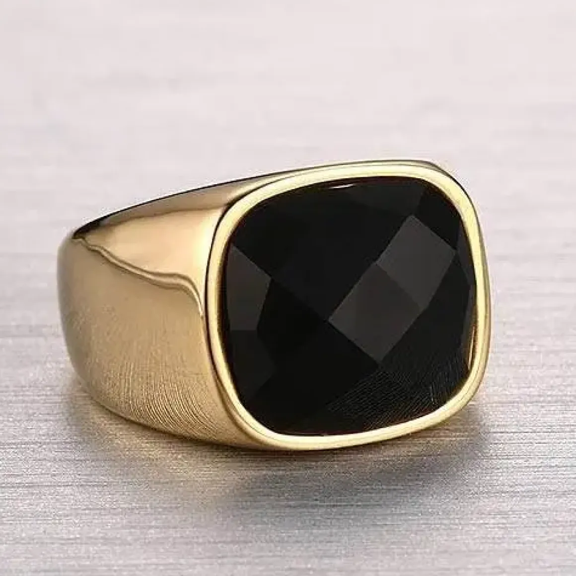 Stor flot forgyldt herrering med sort facet agat sten i sort.