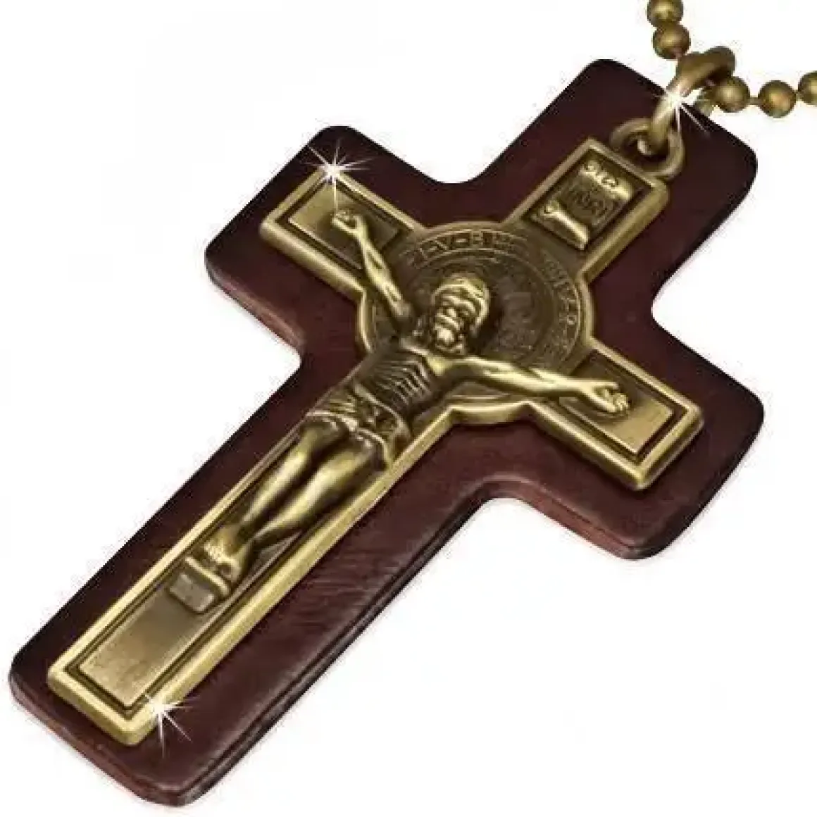 Oxyderet metalkors på læderplade, som måler 4.5 x 7.5 cm.