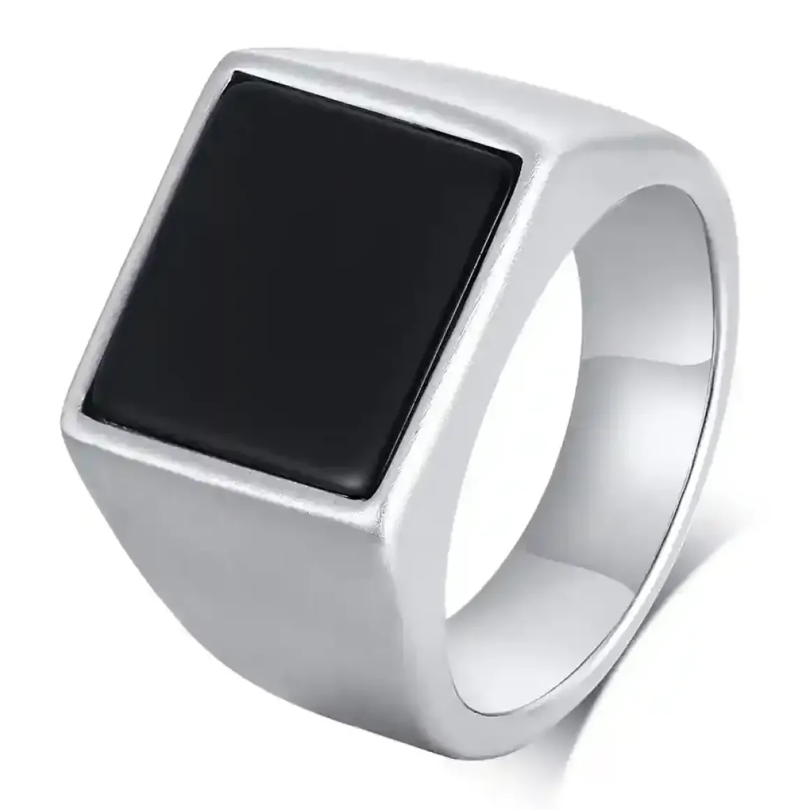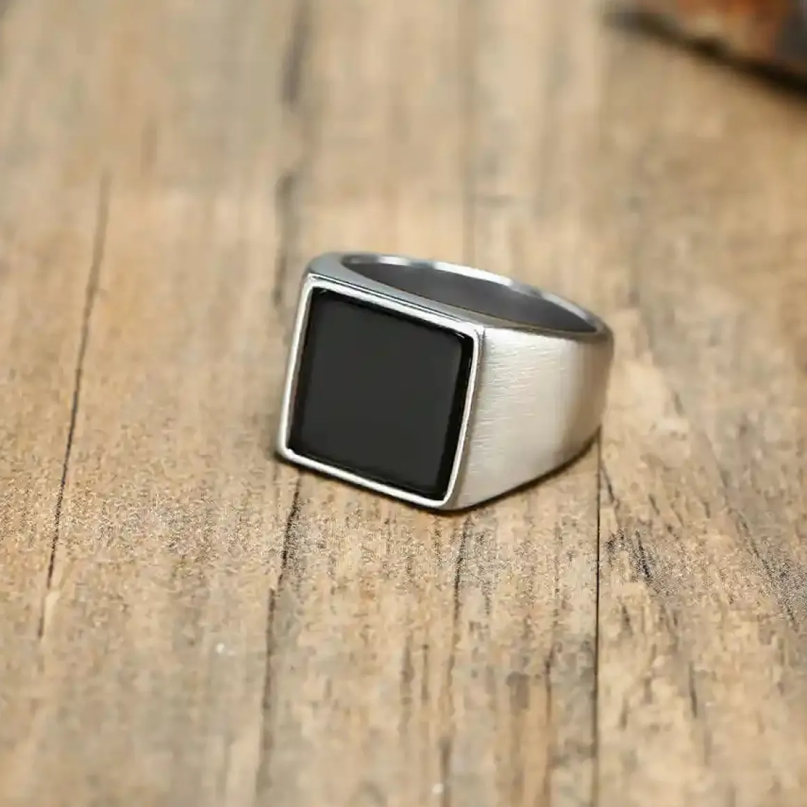 Flot maskulin stil med ‘Mat rustfri stålring med sort agatsten’.