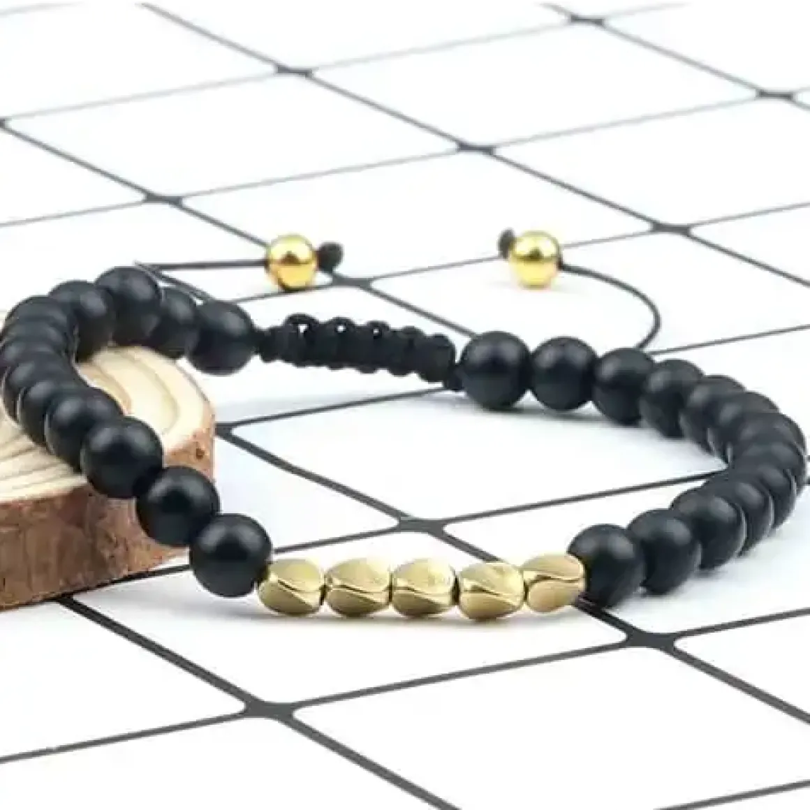 6mm blackstone perler og forgyldte beads.