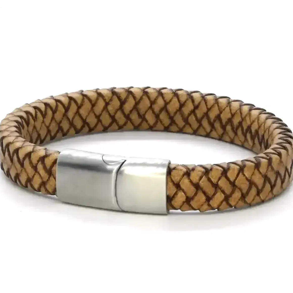 Dette robuste, oldschool brune læderarmbånd, 1,3 cm bredt, har en elegant magnetlås i blankt rustfrit stål.