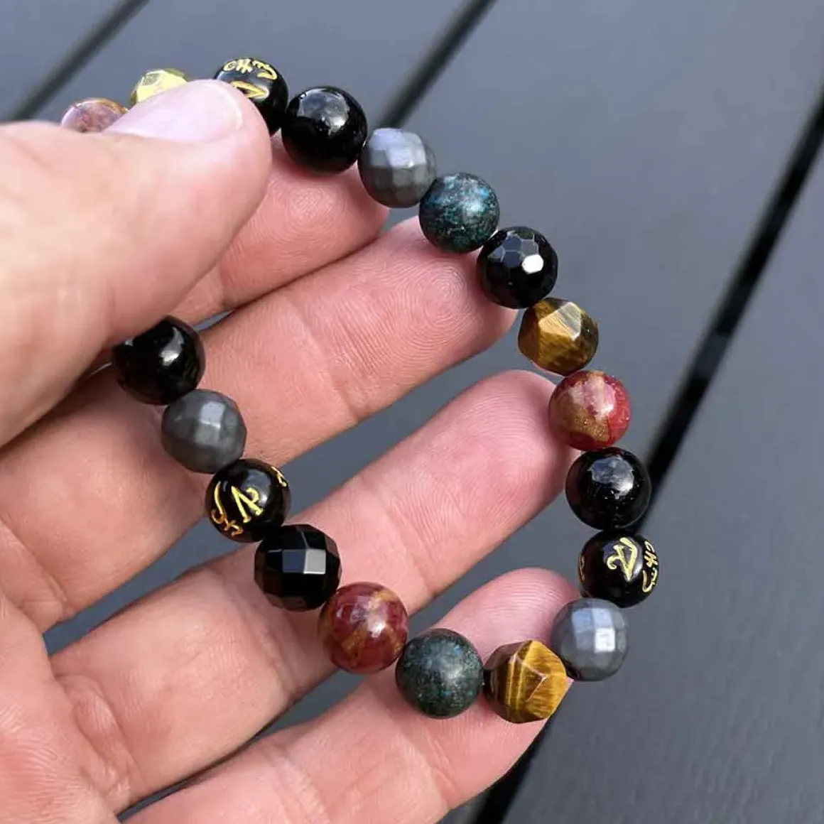 Flot perlearmbånd med Orient design og sorte perler med guld skrift i kina tekst.