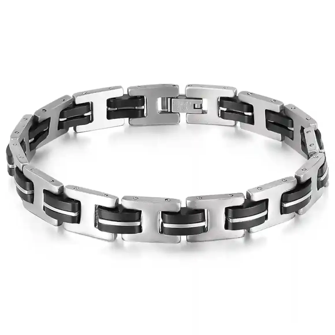 Et stilrent og maskulint armbånd til mænd, fremstillet i rustfrit stål og sort silikone.