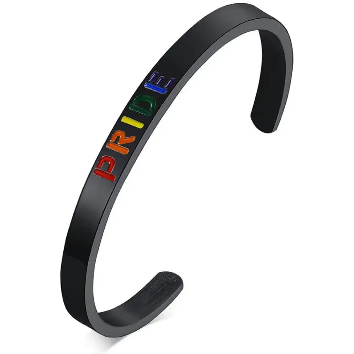 Bangle i sort blackcoatet ædelstål med regnbue skrift PRIDE