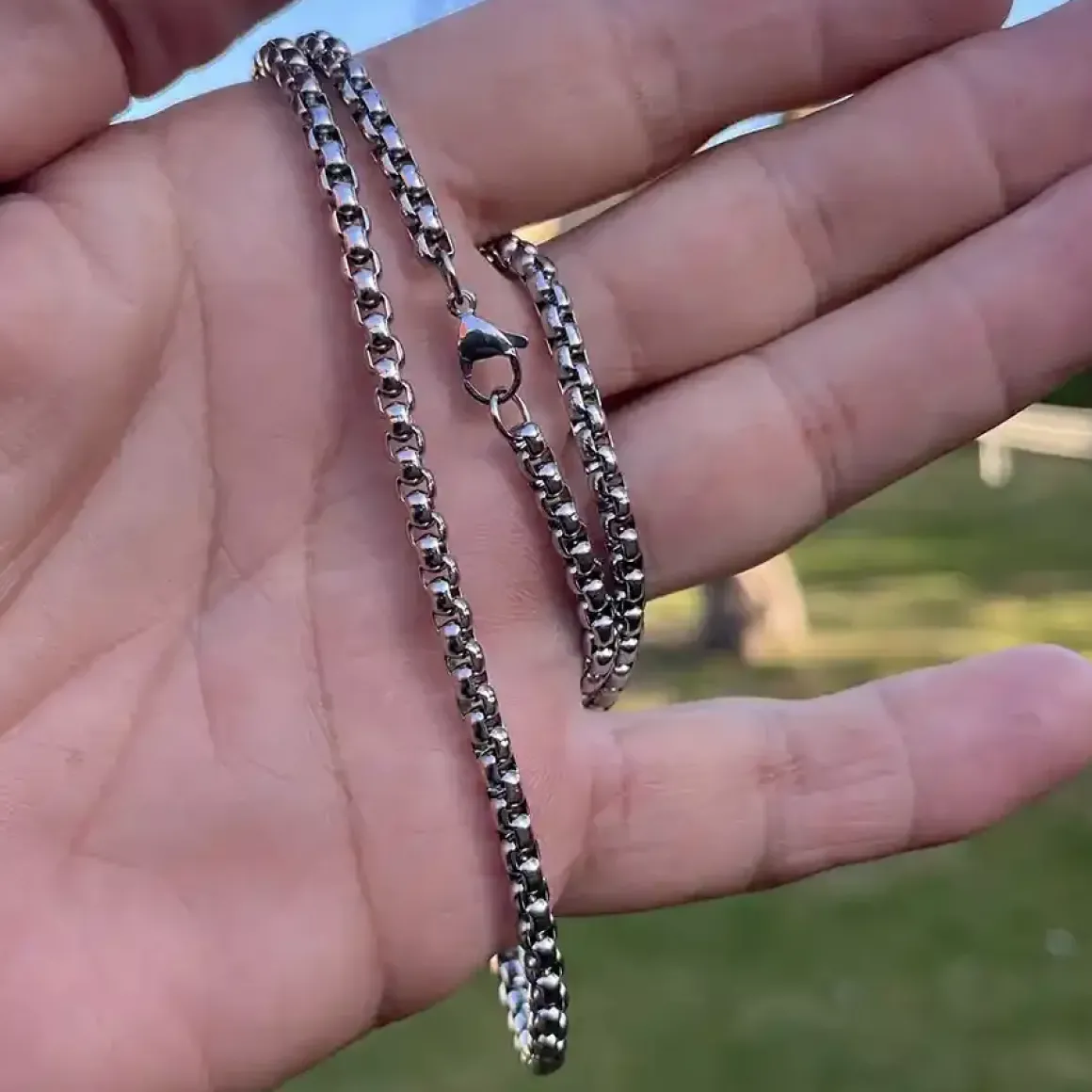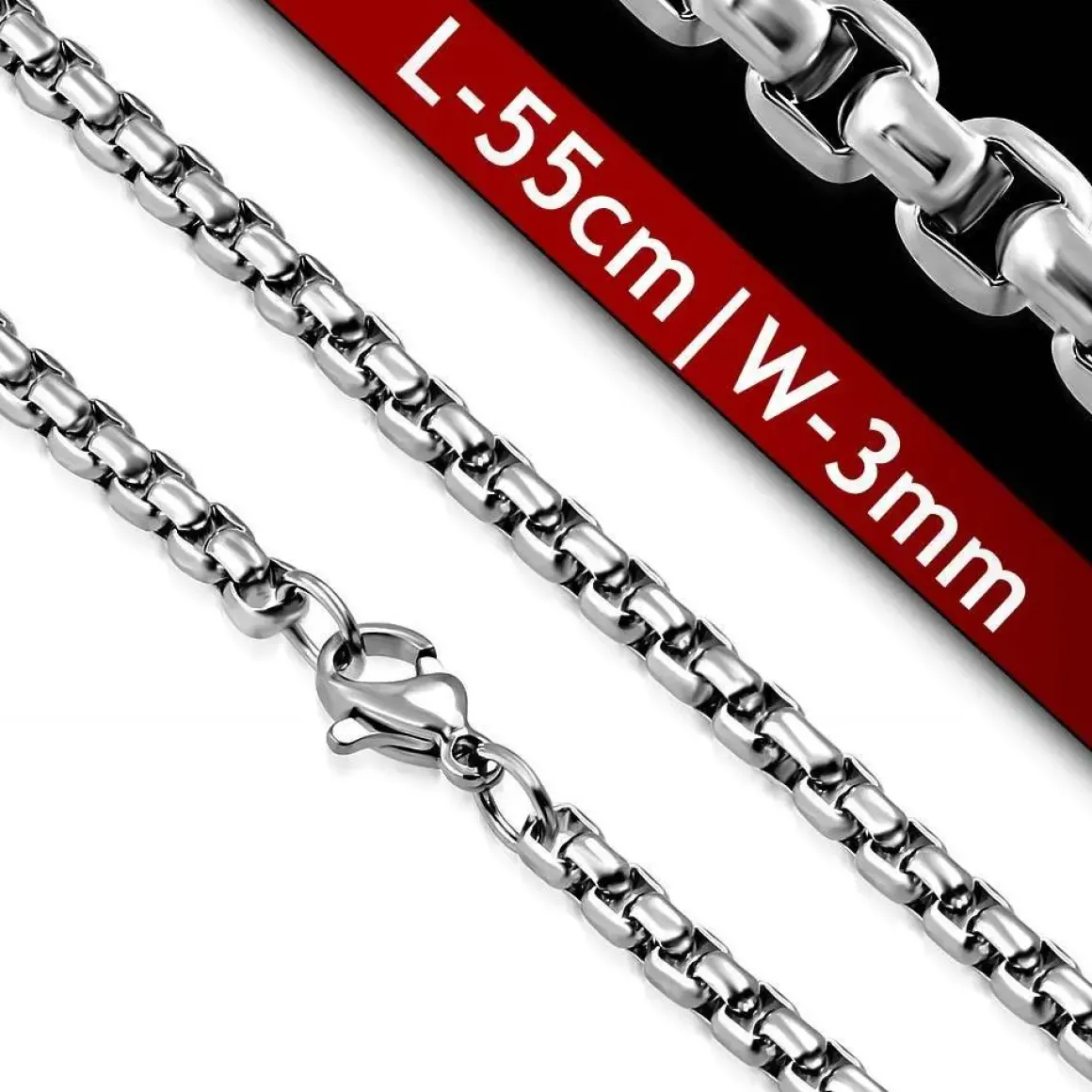 Tæt blok kæde i rustfrit stål med firkantled og 3mm tykkelse.