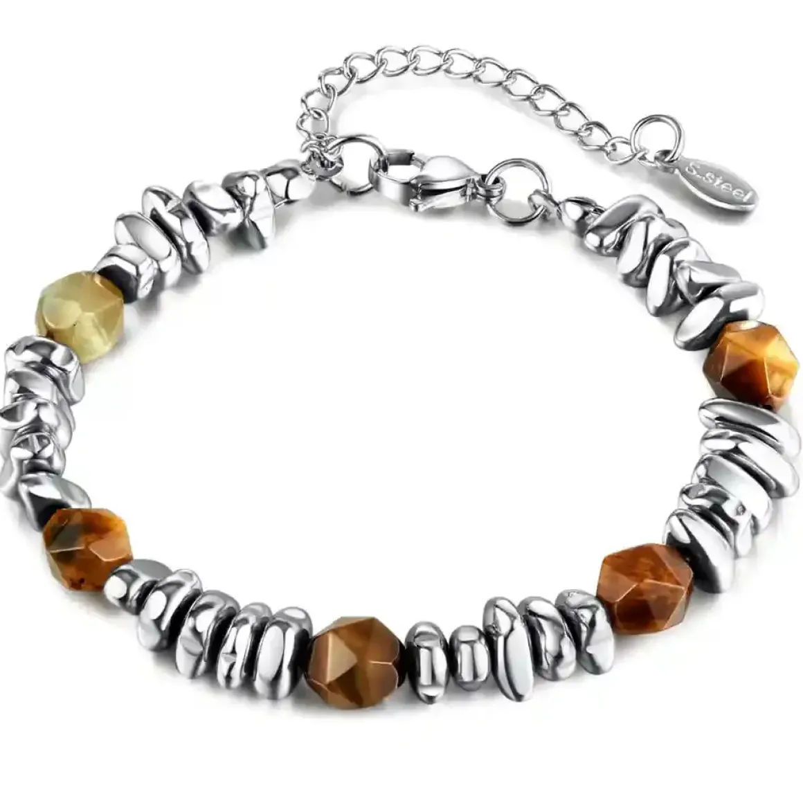 Designet til den moderne mand, dette armbånd kombinerer robuste stålperler med den mystiske charme af facetteret tigereye.